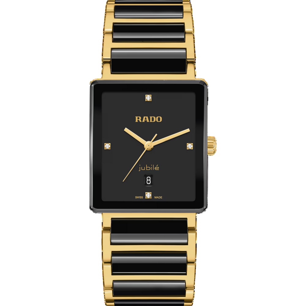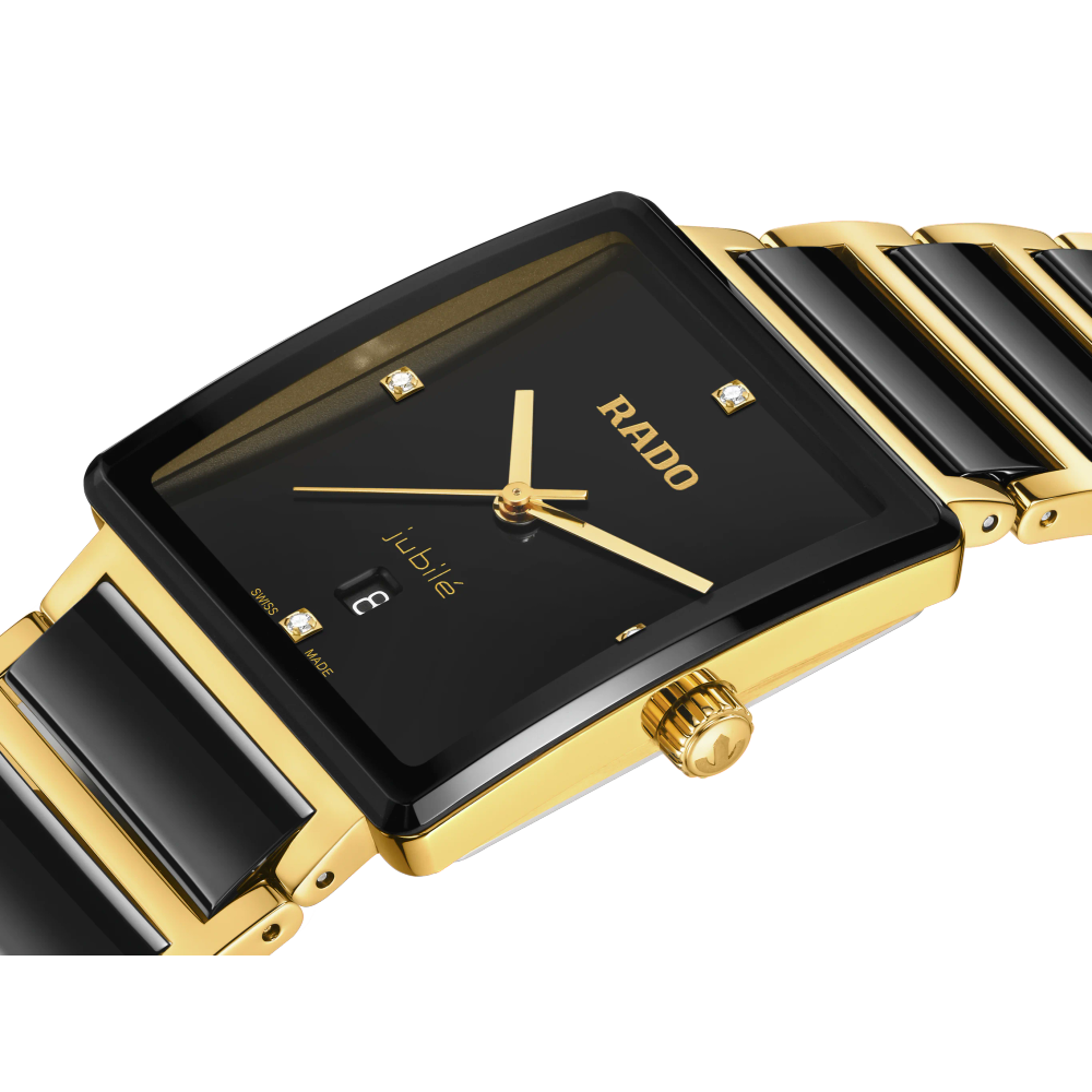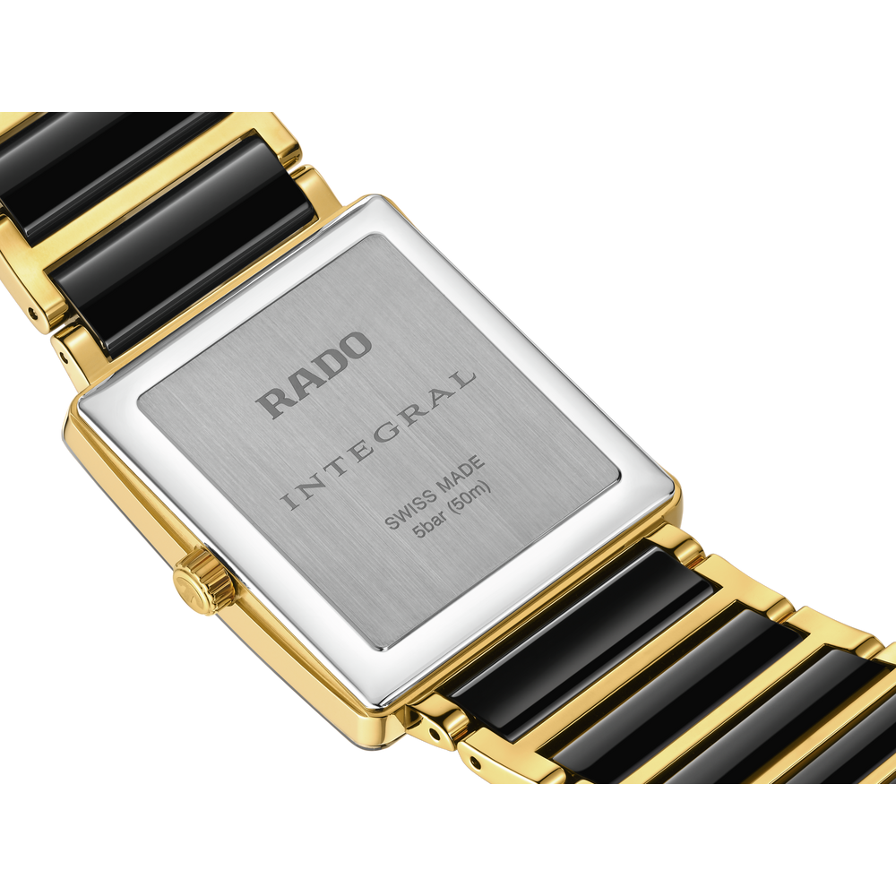 Das ikonische rechteckige Gehäuse aus Edelstahl mit poliertem gelbgoldfarbenen Finish wird von einem randlosen, facettierten Saphirglas mit Antireflexionsbeschichtung und schwarzer Metallisierung vollendet. Gelbgoldfarbene Zeiger gleiten über das schwarz lackierte Zifferblatt und 4 hochkarätige Diamanten. Das Rado Uhrwerk R218 mit 8 Steinen garantiert eine Präzision, die dem Schweizer Standard für zertifizierte Chronometer entspricht – für eine hervorragende Zeitmessung. Die Rado Integral vereint den aussergewöhnlichen Tragekomfort schwarzer Hightech-Keramik-Mittelglieder im sanft verjüngten Armband mit der edlen Präsenz eines prächtigen Saphirglases. Das Tüpfelchen auf dem i: Das gewölbte Glas schmiegt sich harmonisch an die Kontur Ihres Handgelenks – ein unverkennbares Statement für Ihren ausgeprägten Sinn für eleganten Stil.