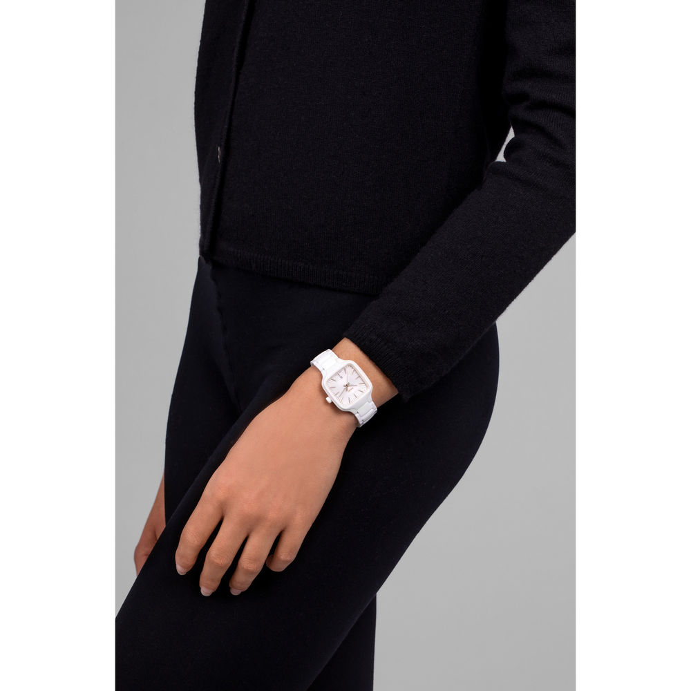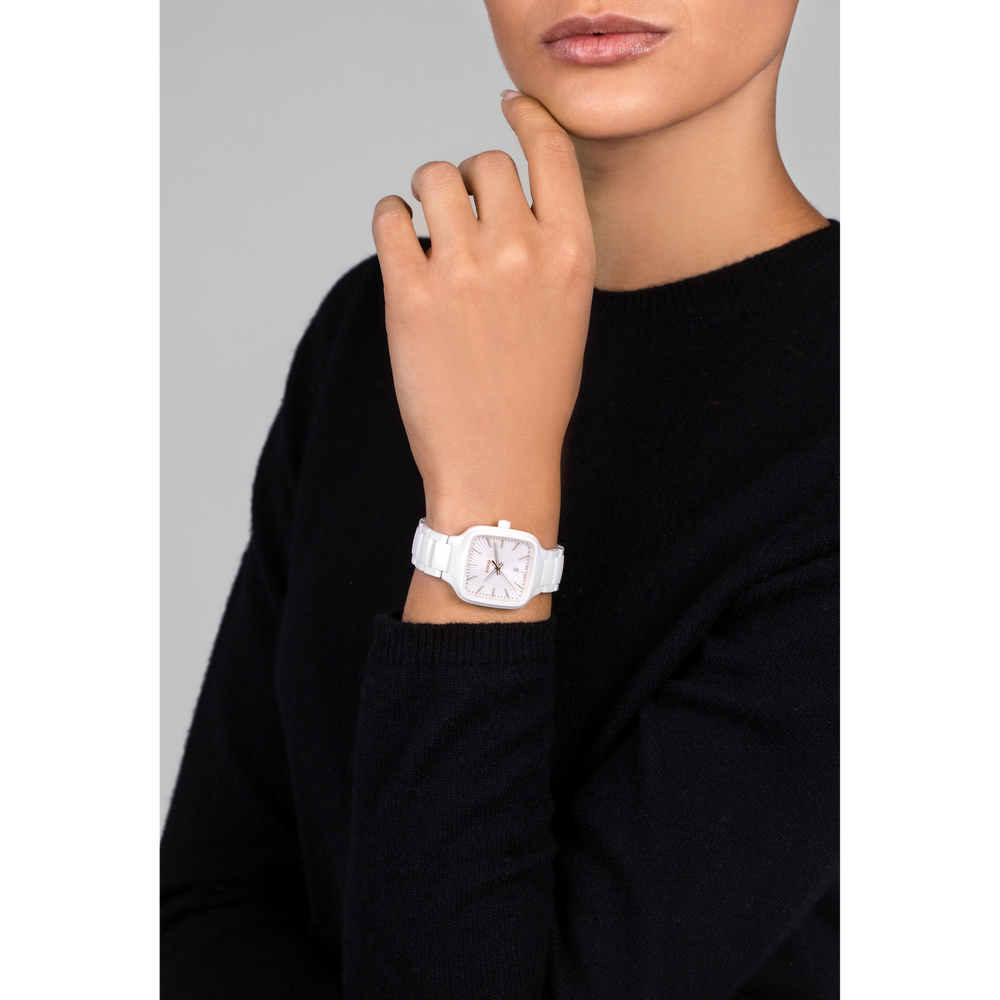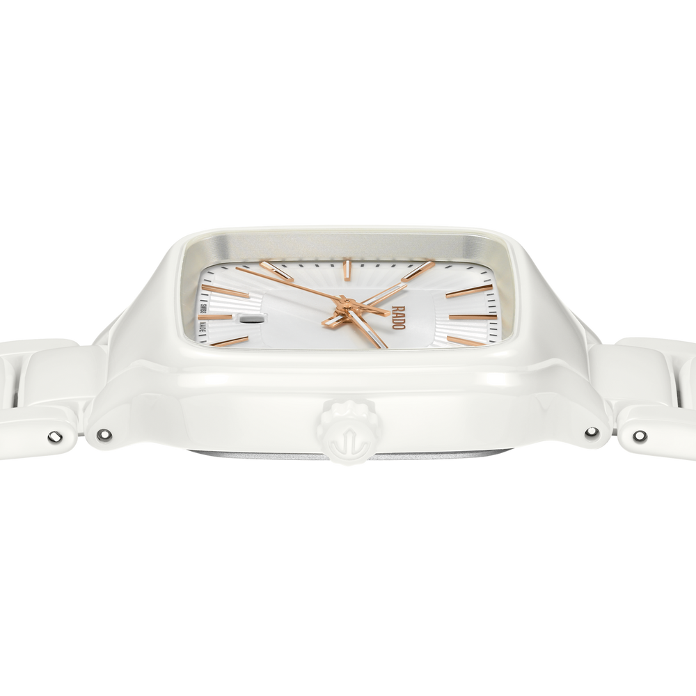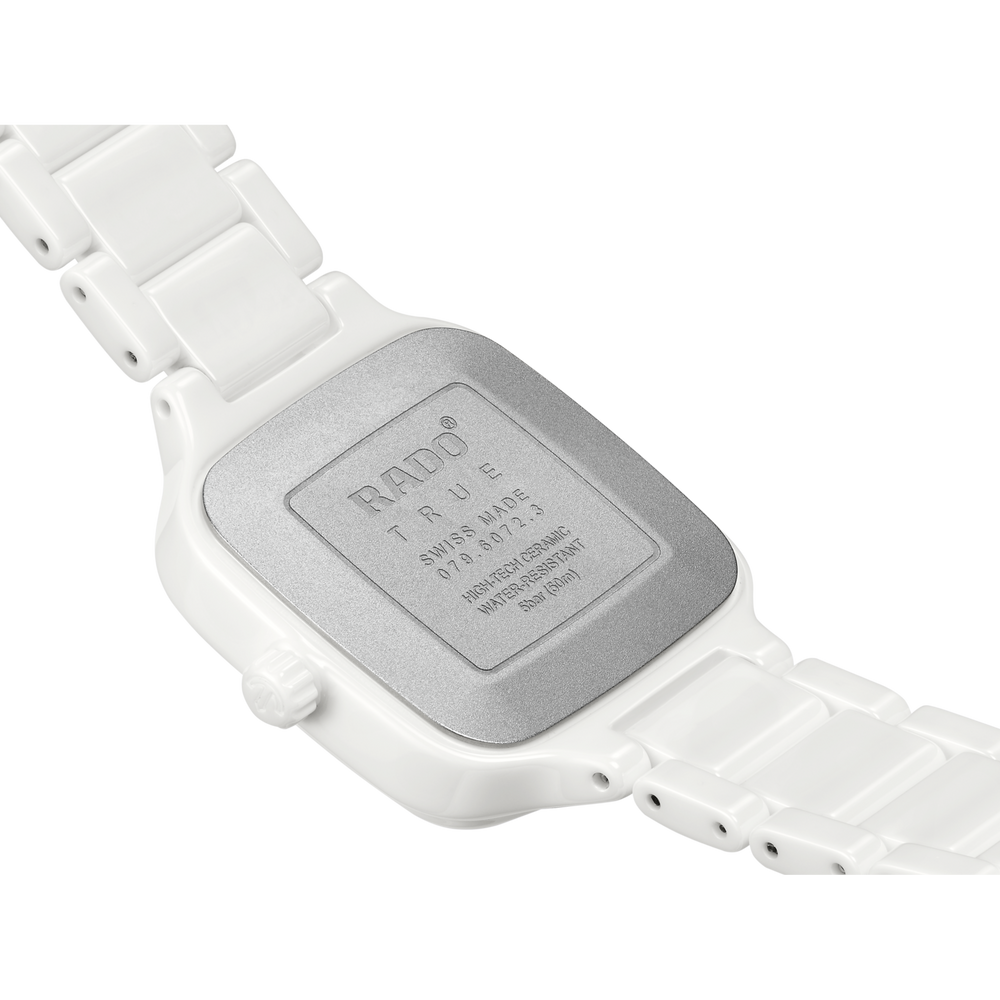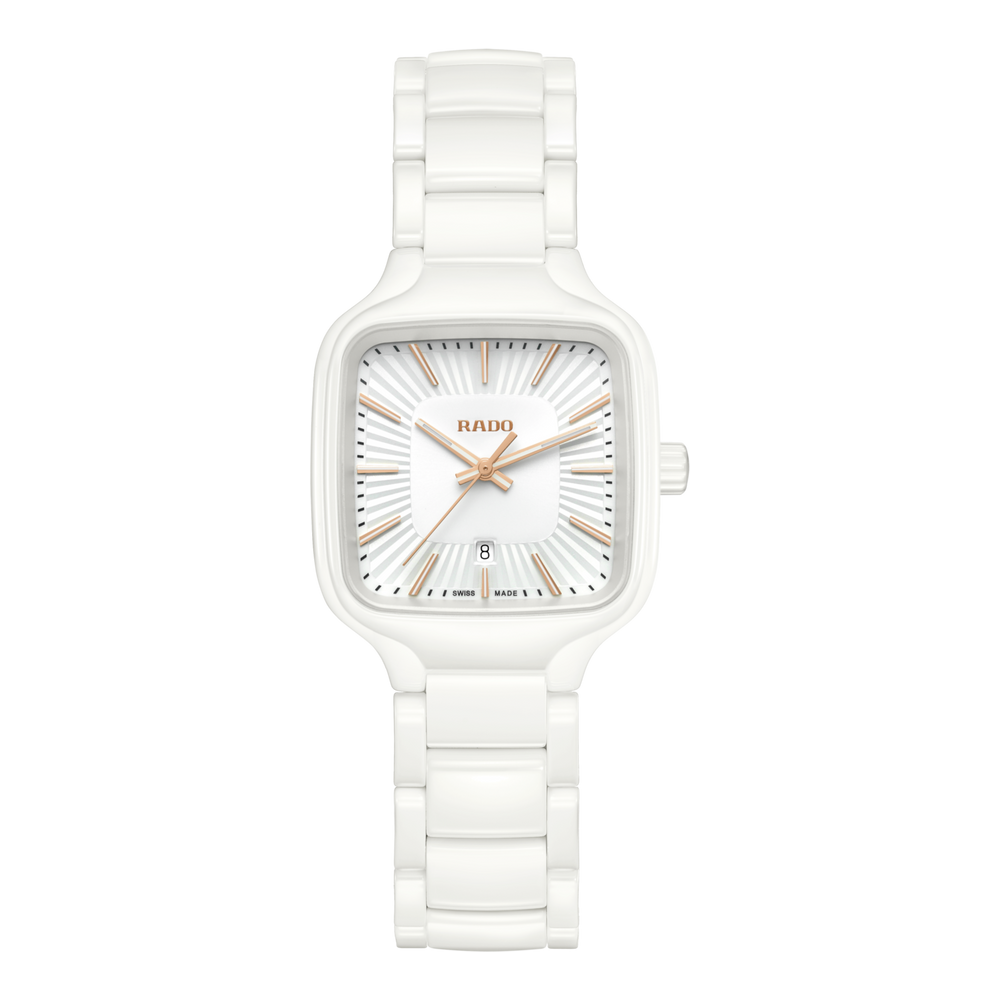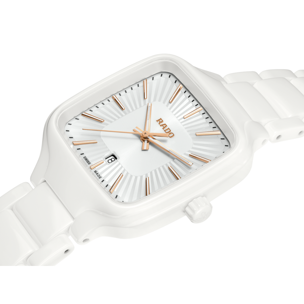 Gehäuse und Krone der 29 mm grossen True Square sind aus polierter weisser Hightech-Keramik gefertigt. Ausserdem verfügt die Uhr über ein flaches Saphirglas. Dank des Rado Quarzwerks vom Kaliber R079 ist die Uhr ein präziser und zuverlässiger Zeitmesser. Die roségoldfarbigen Zeiger und Indizes mit weissem Super-LumiNova® sind farblich perfekt auf das Zifferblatt abgestimmt, das über eine geprägte, strahlenförmig plissierte Struktur in Weiss verfügt. Die Uhr ist bis zu einem Druck von 5 bar wasserdicht. Für den angenehmen Tragekomfort der True Square sorgt ein Armband aus polierter weisser Hightech-Keramik mit Dreifach-Faltschliesse aus Titan.