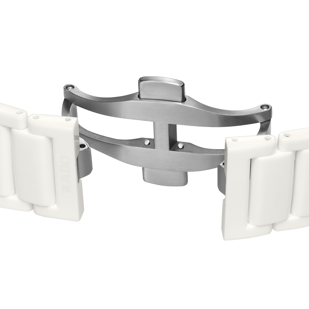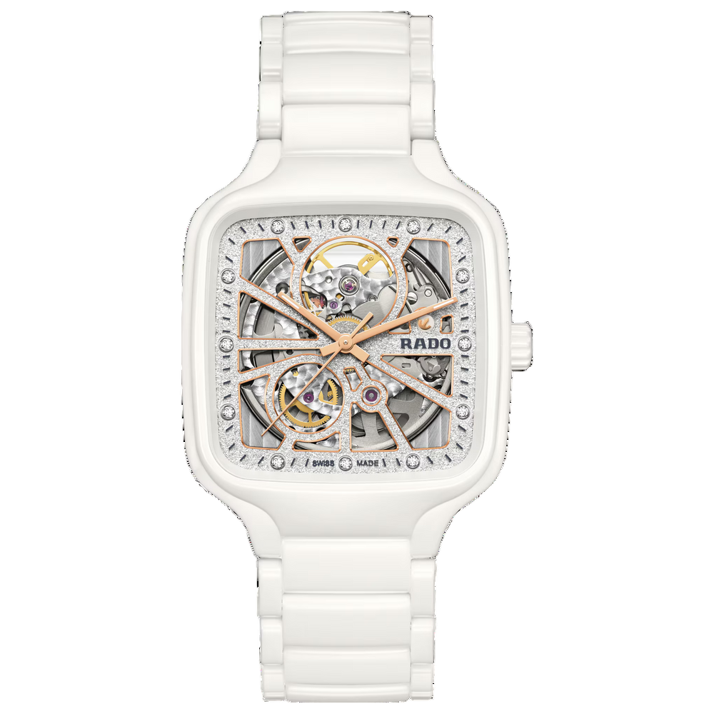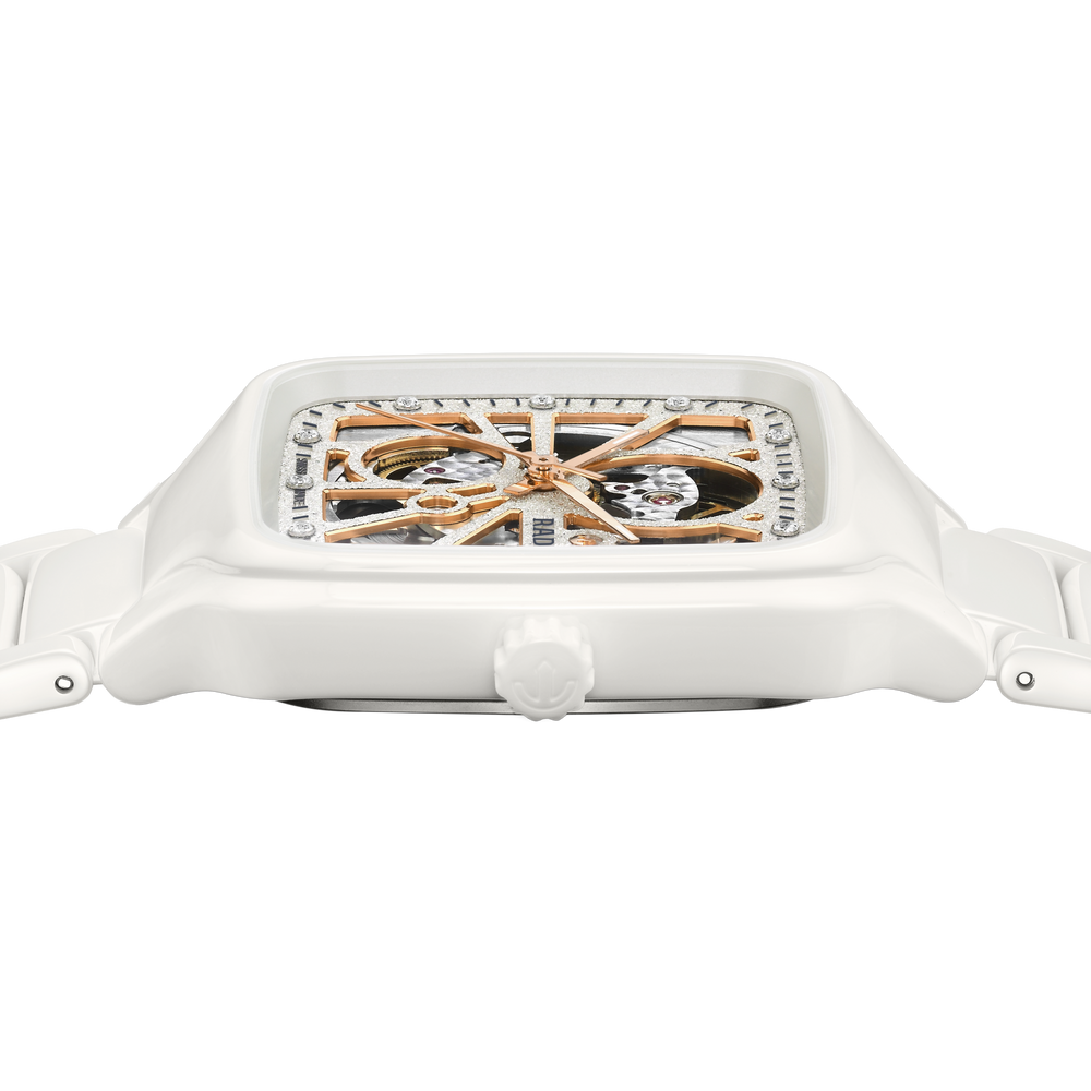 Hochwertige Diamanten und ein funkelndes Zifferblatt verleihen dieser schillernden True Square Open Heart einen frischen Look. Das ikonische quadratische Gehäuse und ein Armband aus polierter weisser Hightech-Keramik rahmen ein innovatives neues Zifferblatt mit rhodiumfarbenem Finish ein, das an Diamantenstaub erinnert. Ein einzigartiges Galvanisierungsverfahren sorgt für den diamantstaubartigen Glanz des Zifferblatts und ermöglicht die Abzeichnung von Rado Logo, Markierungen und Minutenskala als Relief auf dem Zifferblatt – das Endergebnis galvanischen Wachstums. Das funkelnde Zifferblatt und die 12 Indizes mit Jubilé-Diamanten verleihen diesem Modell einen schillernden, eleganten und luxuriösen Look. Ein flach reliefiertes graues Minutenband umgibt die roségoldfarbenen Stunden- und Minutenzeiger mit Super-LumiNova®-Akzenten und einen roségoldfarbenen Sekundenzeiger. Das faszinierende durchbrochene Design lädt dazu ein, das Rado Kaliber R734 zu bewundern, ein Automatikwerk mit 25 Steinen, 3 Zeigern, einer antimagnetischen NivachronTM Spiralfeder und einer bemerkenswerten Gangreserve von 80 Stunden.