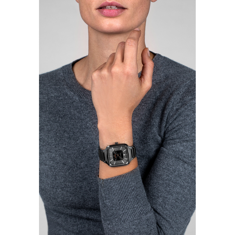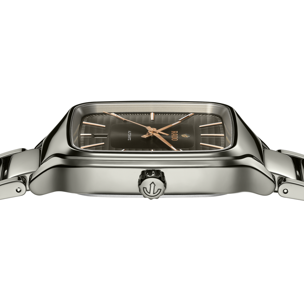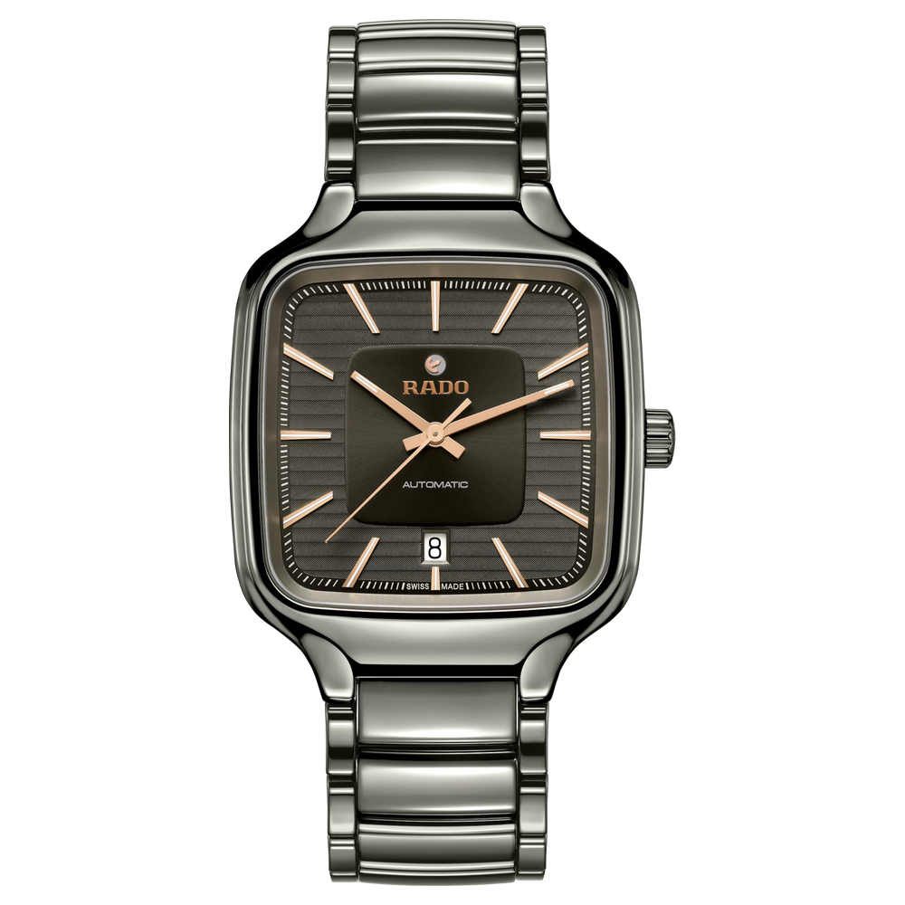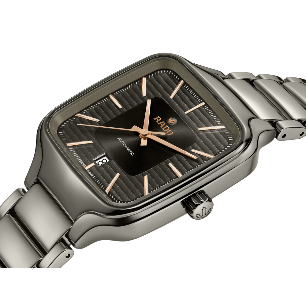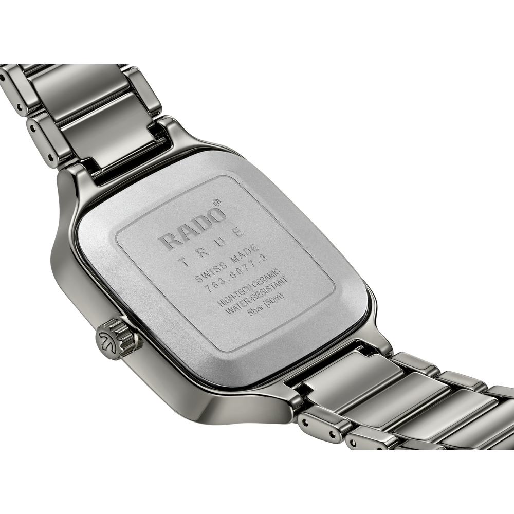 Gehäuse und Krone der 38 mm grossen True Square sind aus polierter Plasma-Hightech-Keramik gefertigt. Ausserdem verfügt die Uhr über ein flaches Saphirglas. Dank des Rado Automatikwerks R763 ist die Uhr ein präziser und zuverlässiger Zeitmesser. Die roségoldfarbenen Zeiger und Indizes mit weissem Super-LumiNova® sind farblich perfekt auf das Zifferblatt abgestimmt. Dieses verfügt über eine geprägte horizontale Struktur in Grau. Die Uhr bietet eine Gangreserve von 80 Stunden und ist bis zu einem Druck von 5 bar wasserdicht. Für den angenehmen Tragekomfort der True Square sorgt ein Armband aus polierter Plasma-Hightech-Keramik mit Dreifach-Faltschliesse aus Titan.