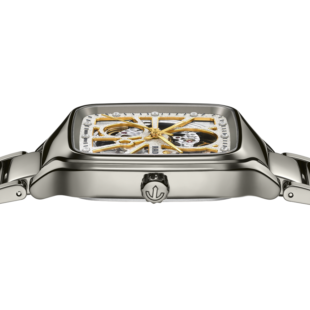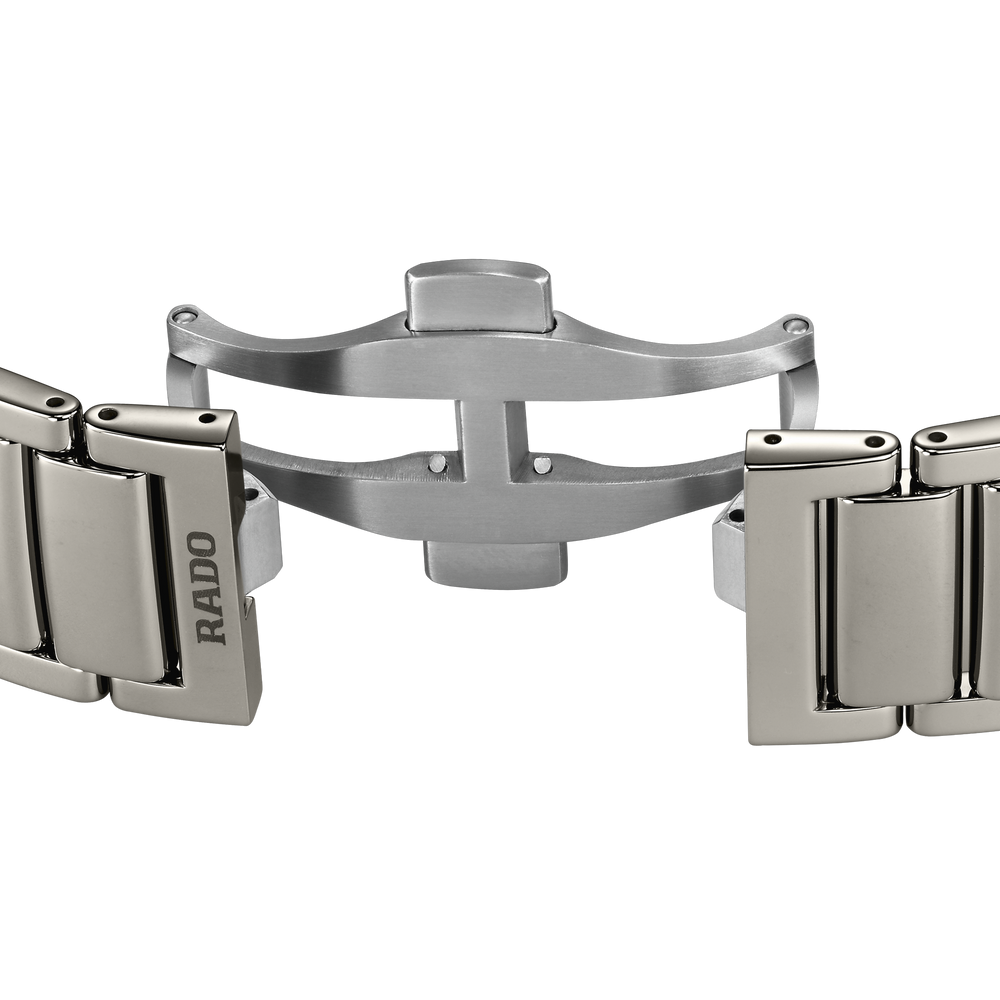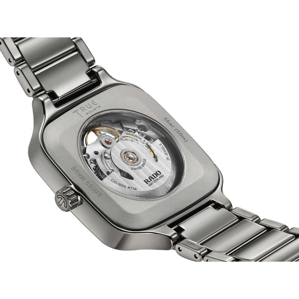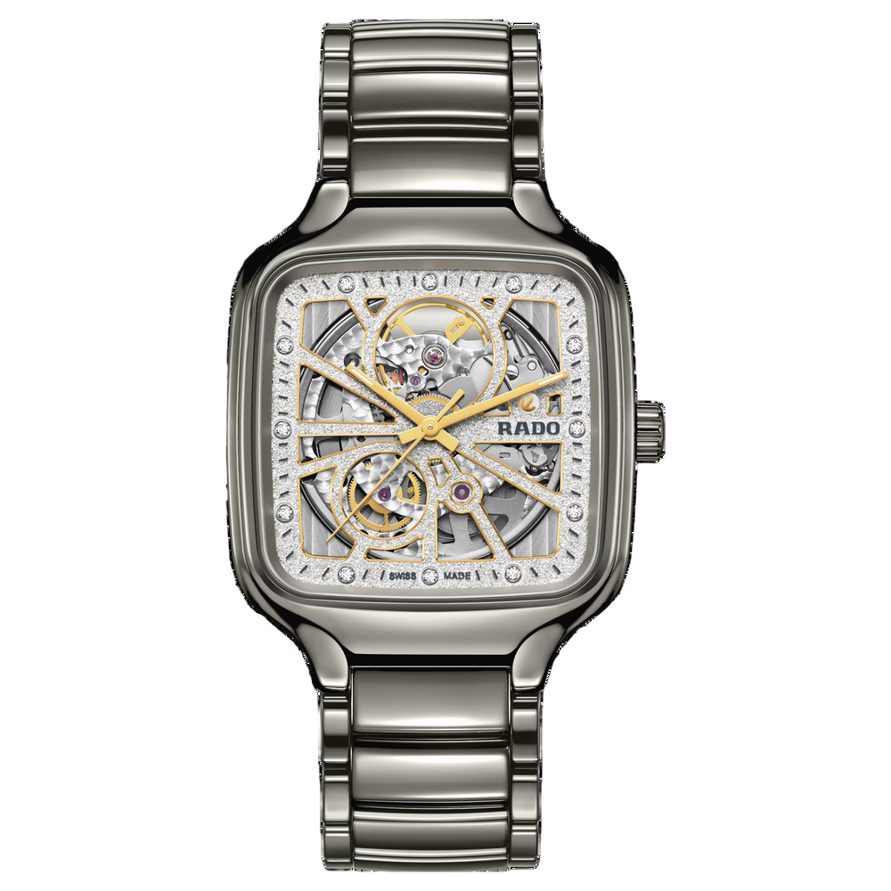 Diese Rado True Square Open Heart glänzt mit hochwertigen Diamanten, einem funkelnden neuen Zifferblatt und einem quadratischen Monobloc-Gehäuse aus polierter Plasma-Hightech-Keramik. Ein Saphirglas verleiht dem Zifferblatt mit 12 Diamantindizes und einem rhodiumfarbenen, diamantstaubartigen Finish zusätzlichen Glanz. Ein flach reliefiertes graues Minutenband umgibt die gelbgoldfarbenen Stunden- und Minutenzeiger mit Super-LumiNova®-Akzenten und einen gelbgoldfarbenen Sekundenzeiger. Aussparungen lenken den Blick auf das Herzstück der Uhr, wo das Automatikwerk vom Rado Kaliber R734 mit einer antimagnetischen NivachronTM Spiralfeder und einer bemerkenswerten Gangreserve von 80 Stunden für zuverlässige Präzision sorgt. Das Zifferblatt wurde mittels eines einzigartigen Galvanisierungsverfahrens entwickelt, das für ein diamantstaubartiges Finish des Zifferblatts sorgt und die Abzeichnung von Rado Logo, Markierungen und Minutenskala als Relief auf dem Zifferblatt ermöglicht – das Endergebnis galvanischen Wachstums. Polierte Plasma-Hightech-Keramik, ein schillerndes Zifferblatt und 12 Jubilé-Diamanten erzeugen ein Gefühl von unwiderstehlichem Luxus und Eleganz.