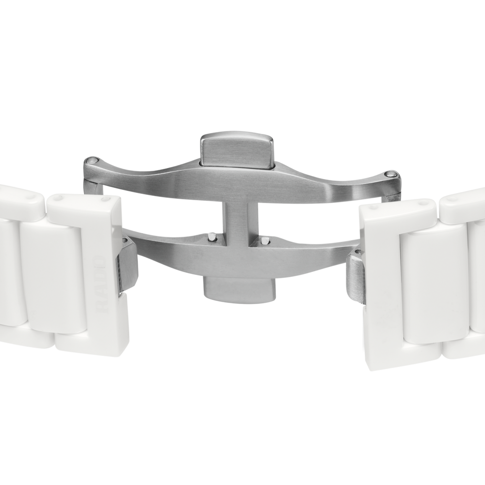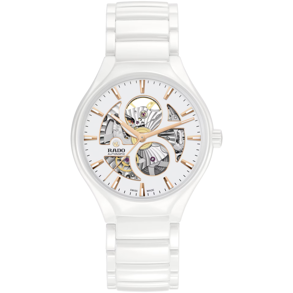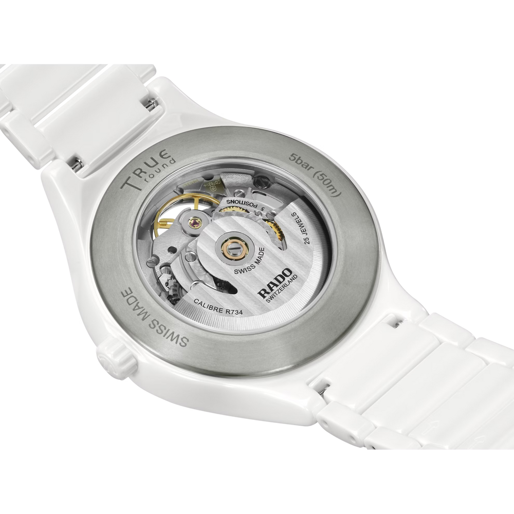 Mit der Rado True Round Open Heart erleben Sie die perfekte Verbindung von exzellentem Design und meisterhafter Materialbeherrschung. Dieser bemerkenswerte Zeitmesser besticht durch sein bezauberndes Open-Heart-Design mit durchbrochenem Zifferblatt, durch das man die komplexe Mechanik des Rado Automatikwerks Kaliber R734 bewundern kann. Das Modell ist zudem mit einer antimagnetischen Nivachron™ Spiralfeder ausgestattet und bietet eine Gangreserve von 80 Stunden. Es verfügt über ein Monobloc-Gehäuse und eine Krone aus polierter weisser Hightech-Keramik und einen Gehäuseboden aus Titan mit eingelassenem Saphirglas, das einen atemberaubenden Blick auf das Uhrwerk freigibt. Das Modell hat ein weisses Zifferblatt mit Sonnenschliff, roségoldfarbenen Facetten und einer grauen Minuteneinteilung. Farblich perfekt abgestimmt ist auch das Armband aus polierter weisser Hightech-Keramik mit einer Dreifach-Faltschliesse aus Titan. Die Uhr ist wasserdicht bis zu einem Druck von 5 bar (50 m). Die Rado True Round Open Heart ist eine jener Uhren, die nicht nur durch und durch zeitgenössisch sind, sondern auch über eine Langlebigkeit und einen Stil verfügen, die sie zu echten Erinnerungsstücken machen.