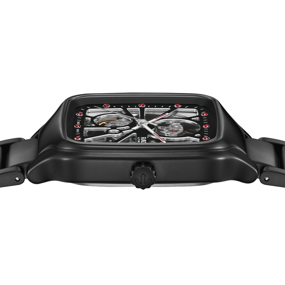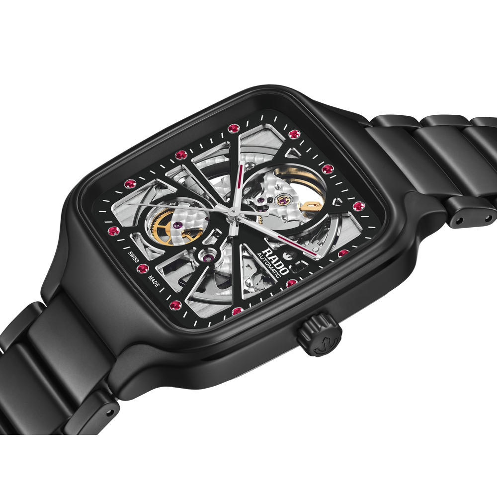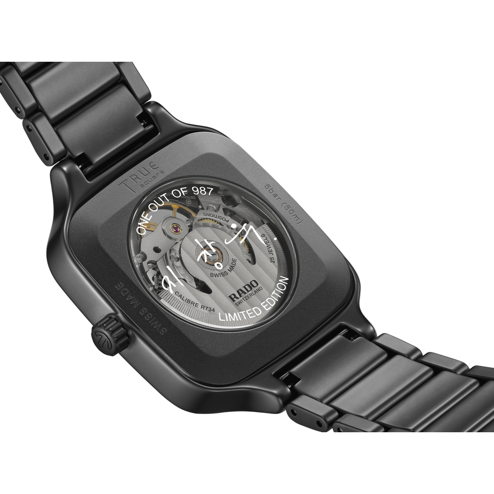Der koreanische Schauspieler und Filmstar Ji Chang-wook ist globaler Markenbotschafter von Rado und Mitgestalter seiner eigenen limitierten Auflage der True Square Open Heart. Bei diesem Modell wird ein elegantes Monobloc-Gehäuse aus mattschwarzer Hightech-Keramik durch ein flaches Saphirglas mit beidseitiger Antireflexbeschichtung vollendet, das einen klaren Blick auf ein grossflächiges Zifferblatt und seine Stundenindizes freigibt – 12 leuchtende Rubine mit passenden roten Super-LumiNova®-Akzenten auf den Zeigern. Das schwarze Open Heart-Zifferblatt mit nickelfarbenen Facetten und einem feinen, vertikal gebürsteten Finish wird von einem Côtes de Genève-Dekor mit Perlierung geziert und von einer aufgedruckten weissen Minutenskala eingerahmt. Auf dem Gehäuseboden aus sandgestrahltem Titan mit getöntem Saphirglas ist die weisse Aufschrift „LIMITED EDITION, ONE OUT OF 987“ sowie die Unterschrift von Ji Chang-wook zu sehen, ebenfalls in Weiss. Im Inneren dieses atemberaubenden neuen Modells befindet sich das Rado Kaliber R734, ein Automatikwerk mit 25 Steinen und 3 Zeigern, das die Standardtestanforderungen übertrifft und über eine antimagnetische Nivachron Spiralfeder sowie eine bemerkenswerte Gangreserve von 80 Stunden verfügt. Wasserdichtigkeit bis 5 bar (50 m).