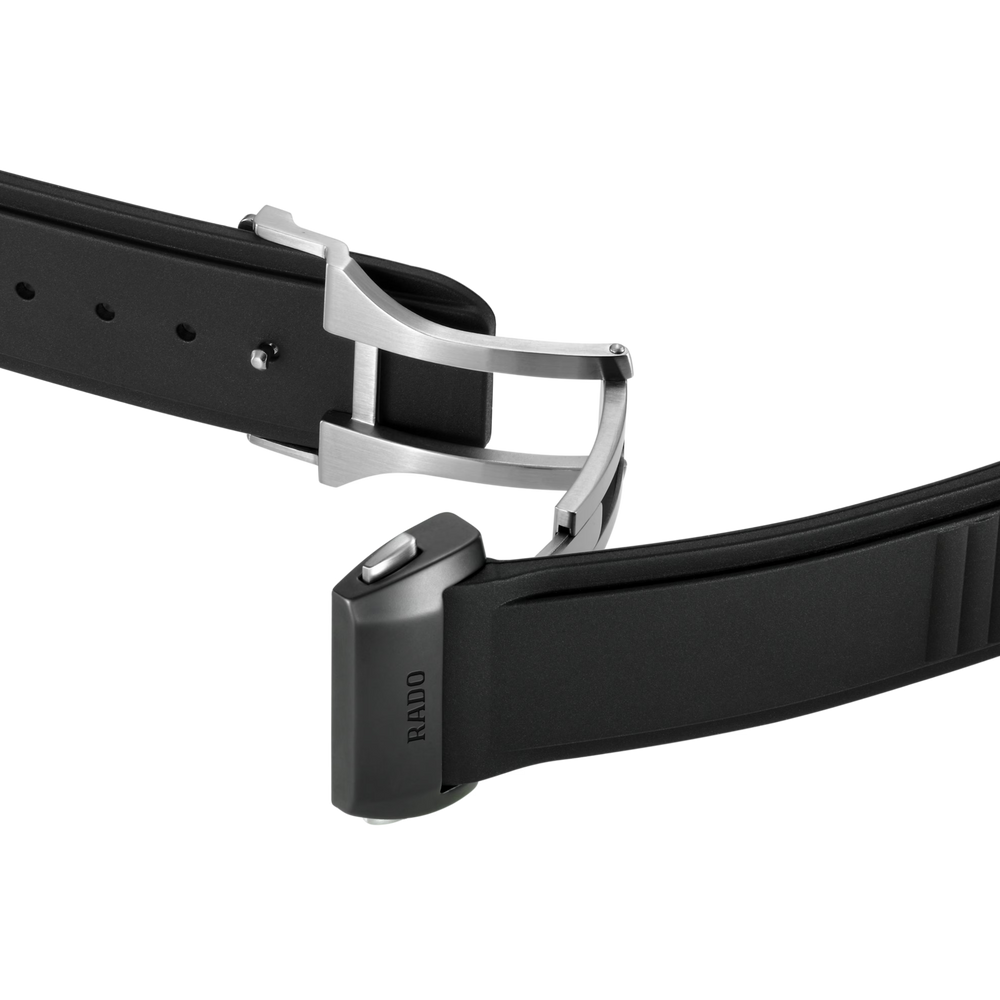 Abgerundet wird das Gehäusedesign schliesslich durch ein schwarzes Kautschukarmband, das nahtlos in eine erweiterbare Faltschliesse aus Edelstahl mit einer Abdeckung aus mattierter Hightech-Keramik übergeht.