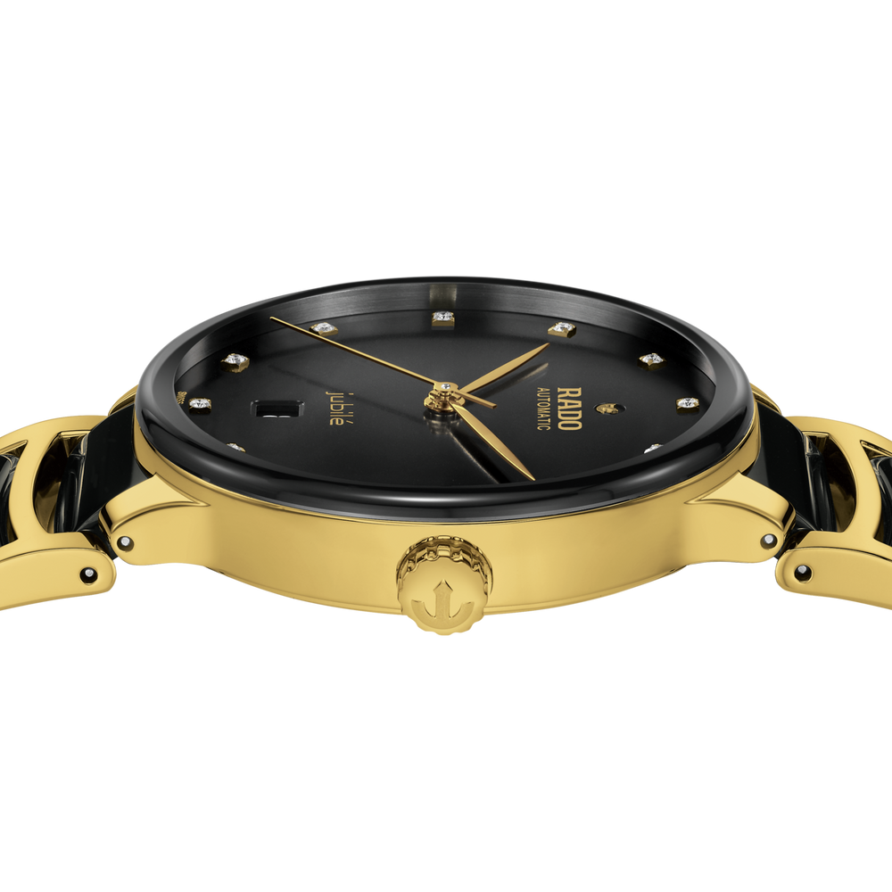 Die klassische Centrix Automatic Diamonds wurde nicht nur technisch, sondern auch ästhetisch überarbeitet. Beim neuen Modell reicht das abgerundete Saphirglas bis zum Rand und scheint beinahe nahtlos in das gewölbte Gehäuse überzugehen. , der nahtlos in das gewölbte Gehäuse übergeht. Die überarbeiteten Bandanstösse am Gehäuse und das Armband aus poliertem gelbgoldfarbenen Edelstahl mit Mittelgliedern aus schwarzer Hightech-Keramik runden das Gesamtbild dieses ikonischen Zeitmessers perfekt ab. Das schwarze Zifferblatt mit Sonnenschliff und 12 Diamanten kommt durch das aufgedruckte Jubilé-Logo noch besser zur Geltung und ist perfekt auf die gelbgoldfarbenen Zeiger abgestimmt. Im Inneren übertrifft das mit drei Zeigern ausgestattete, in 5 statt 3 Lagen getestete Uhrwerk Kaliber R763 dank einer nicht-magnetischen Nivachron™ Spiralfeder die Standardtestanforderungen und sorgt für eine höhere Zuverlässigkeit und Genauigkeit. Die Uhr ist bis zu einer Tiefe von 50 m wasserdicht und bietet eine Gangreserve von 80 Stunden.