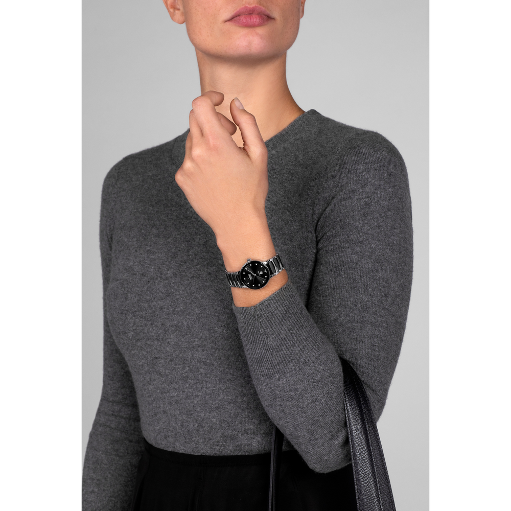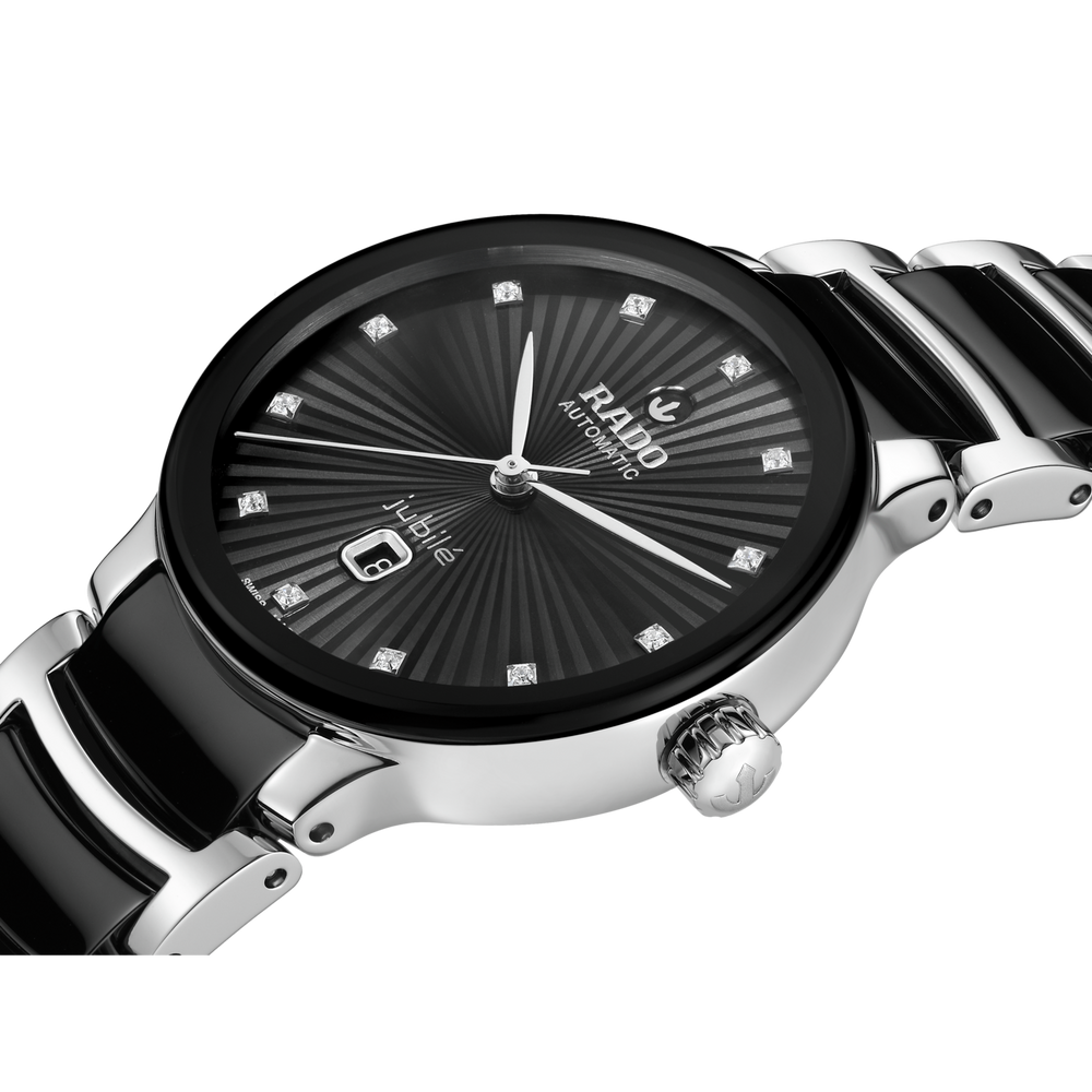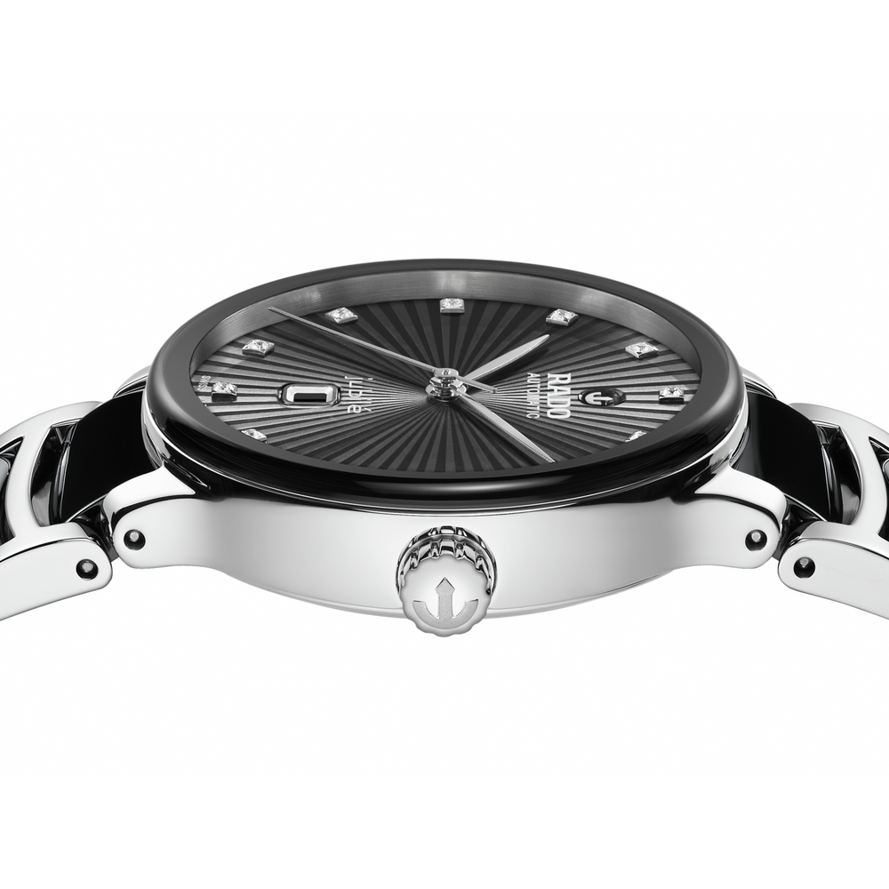 Die klassische Centrix Automatic Diamonds wurde nicht nur technisch, sondern auch ästhetisch überarbeitet. Beim neuen Modell reicht das abgerundete Saphirglas bis hin zum Rand. Außerdem geht das gewölbte Gehäuse nahtlos in den geschwungenen Kristallrand über. Die überarbeiteten Bandanstöße am Gehäuse und das Armband aus poliertem Edelstahl mit Mittelgliedern aus schwarzer Hightech-Keramik runden das Gesamtbild dieses ikonischen Zeitmessers perfekt ab. Das schwarze, facettierte Zifferblatt zeichnet sich durch einen opulenten 3D-Effekt aus, der dadurch erzeugt wird, dass das Zifferblatt zunächst geprägt und die Prägung dann mit Lack gefüllt wird. Im Inneren übertrifft das mit drei Zeigern ausgestattete, in 5 statt 3 Lagen getestete Uhrwerk vom Kaliber R582 dank einer nicht-magnetischen Nivachron™ Spiralfeder die Standardtestanforderungen und sorgt für eine höhere Zuverlässigkeit und Genauigkeit. Die Uhr ist bis zu einer Tiefe von 50 m wasserdicht und bietet eine Gangreserve von 48 Stunden.