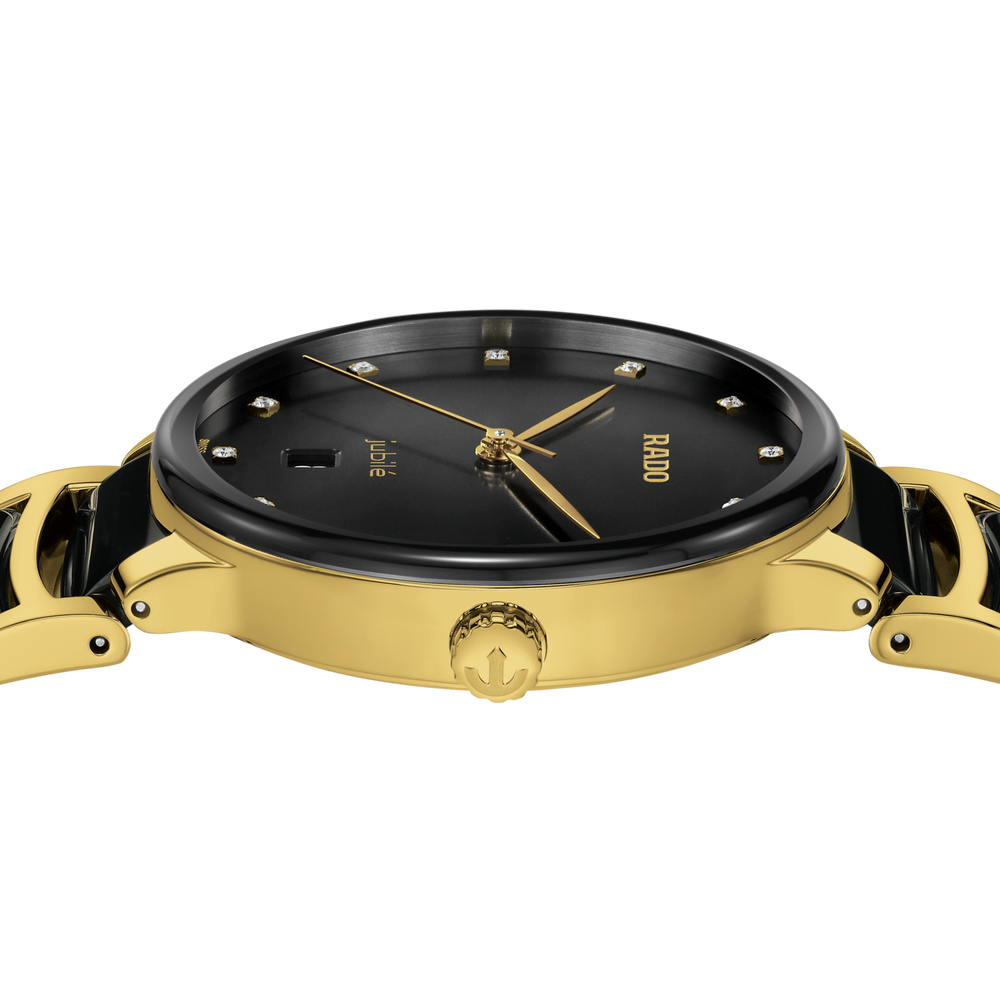 Die klassische Centrix Quartz Diamonds wurde nicht nur technisch, sondern auch ästhetisch überarbeitet. Beim neuen Modell reicht das abgerundete Saphirglas bis hin zum Rand und scheint nahtlos in das sanft gerundete Gehäuse überzugehen. Die Gesamtoptik dieses ikonischen Zeitmessers wird durch überarbeitete Bandanstösse am Gehäuse und ein Armband aus poliertem gelbgoldfarbenem Edelstahl mit PVD-Beschichtung und schwarzer Hightech-Keramik abgerundet. Das schwarze Zifferblatt mit Sonnenschliff und 12 Diamanten kommt durch das aufgedruckte Jubilé-Logo noch besser zur Geltung und ist perfekt auf die gelbgoldfarbenen Zeiger abgestimmt. Dank der PreciDrive- und HeavyDrive-Technologie im R073 Quarzwerk zeichnet sich die Uhr durch eine grössere Genauigkeit und Stossfestigkeit aus. Die Uhr ist bis zu einer Tiefe von 50 m wasserdicht.
