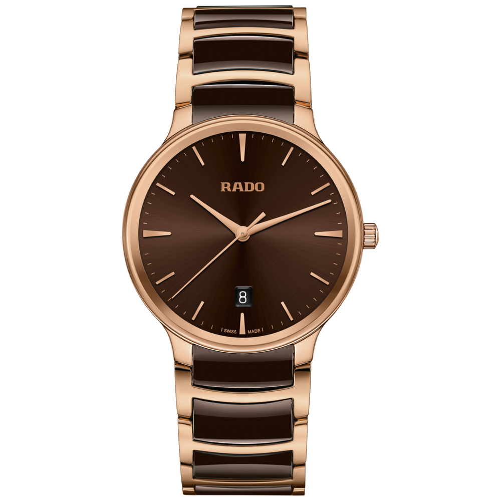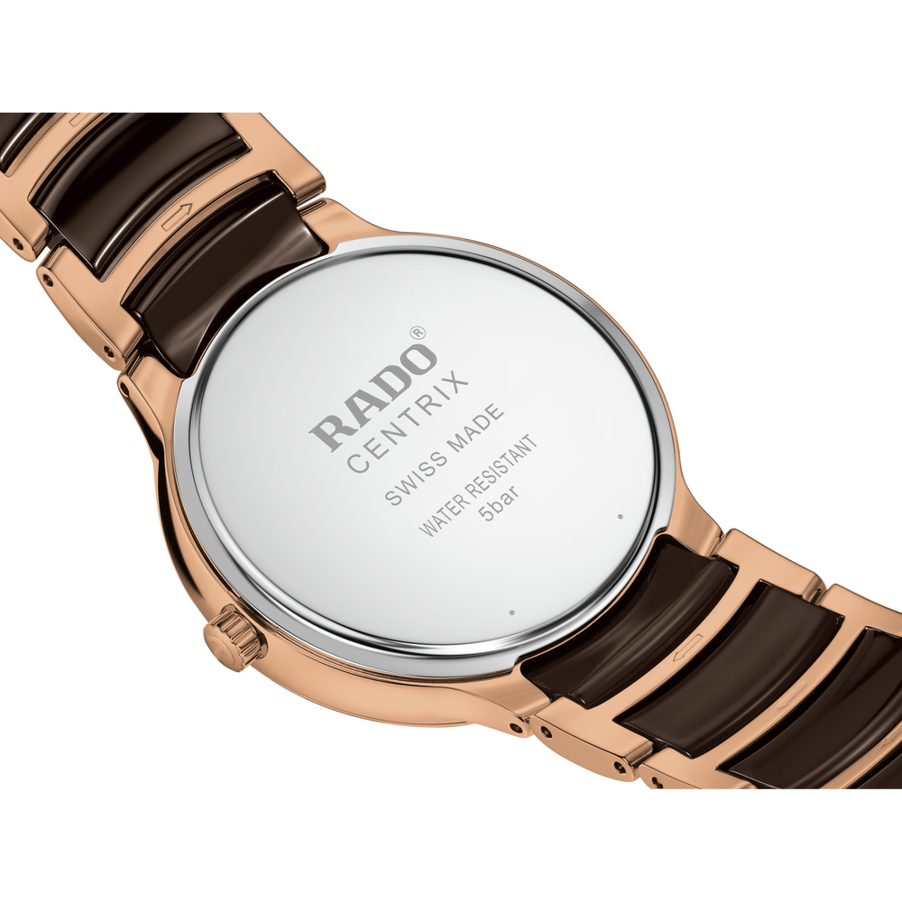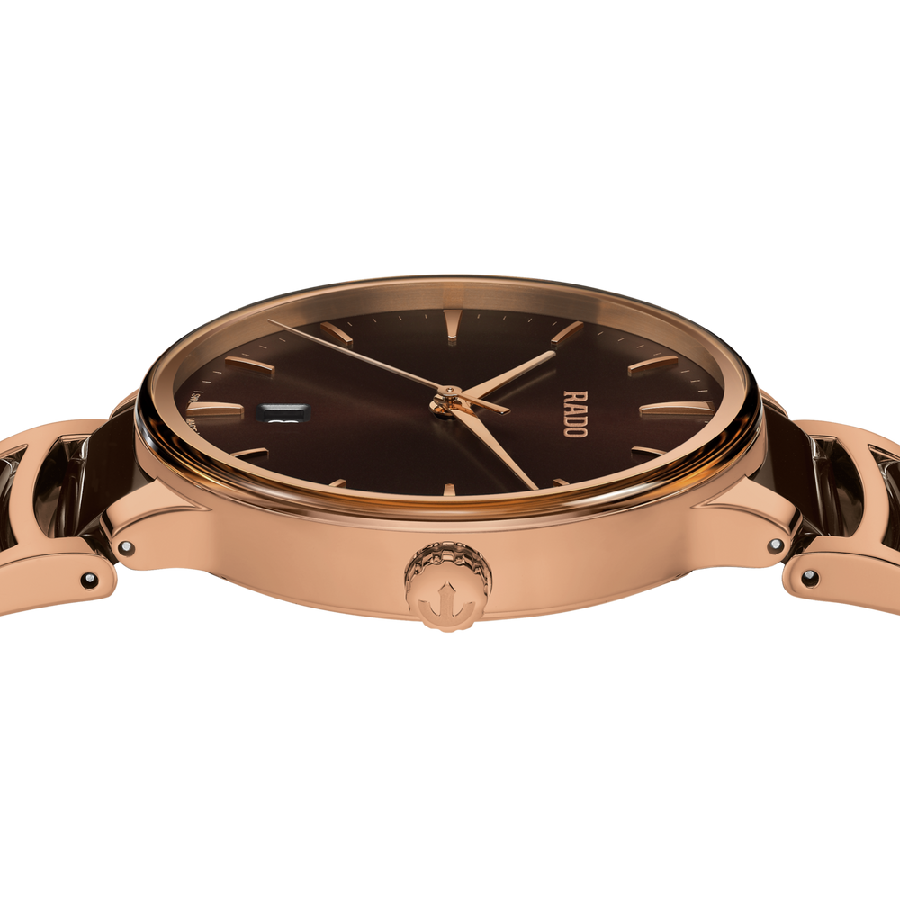 Die klassische Centrix Quartz wurde nicht nur technisch, sondern auch ästhetisch überarbeitet. Beim neuen Modell reicht das gewölbte Saphirglas bis hin zum Rand und scheint nahtlos in das sanft gerundete Gehäuse überzugehen. Die Gesamtoptik dieses ikonischen Zeitmessers wird durch überarbeitete Bandanstösse am Gehäuse und ein Armband aus poliertem roségoldfarbenem Edelstahl mit PVD-Beschichtung und Mittelgliedern aus brauner Hightech-Keramik abgerundet. Das braune Zifferblatt mit Sonnenschliff und roségoldfarbenen applizierten Indizes ist perfekt auf die roségoldfarbenen Zeiger abgestimmt. Dank der PreciDrive- und HeavyDrive-Technologie im R073 Quarzwerk zeichnet sich die Uhr durch eine grössere Genauigkeit und Stossfestigkeit aus. Die Uhr ist bis zu einer Tiefe von 50 m wasserdicht.
