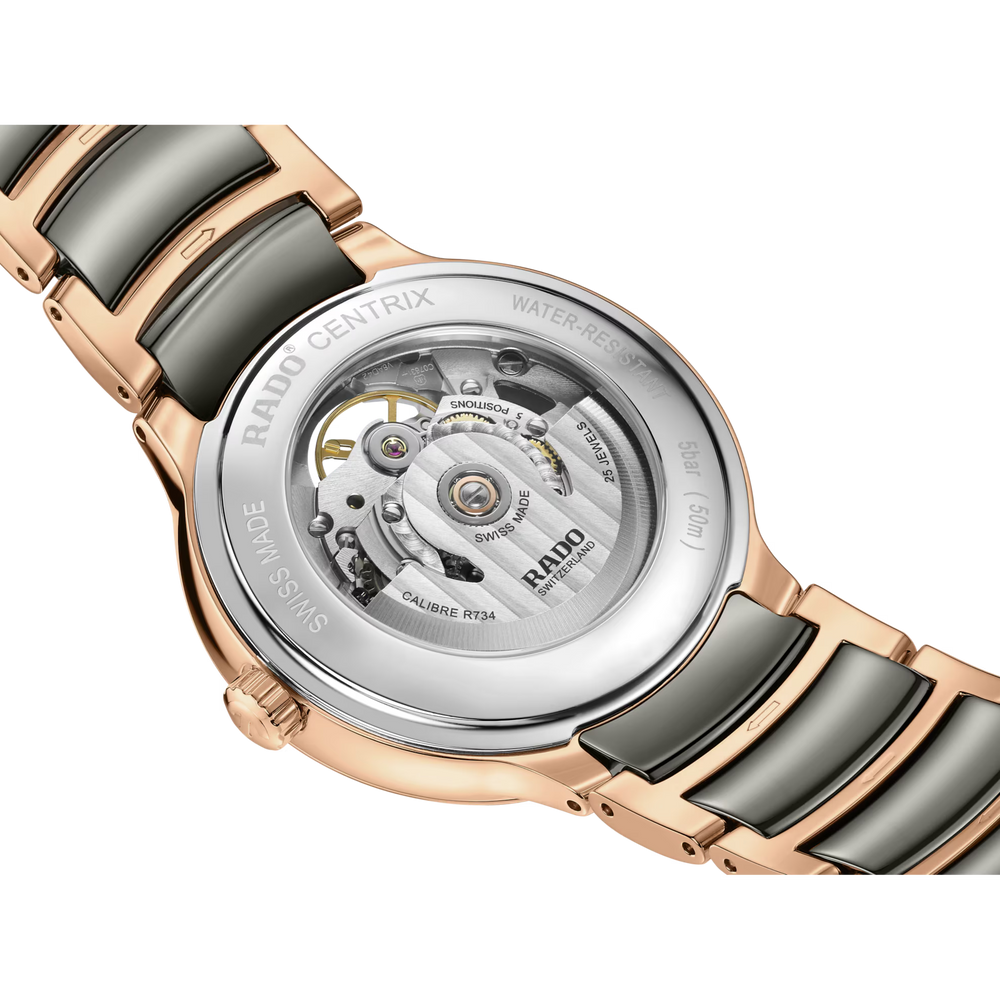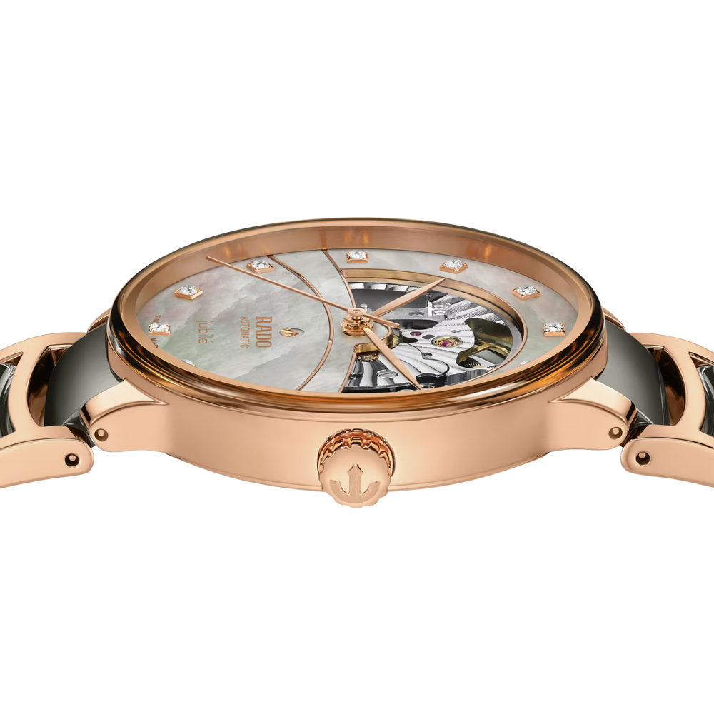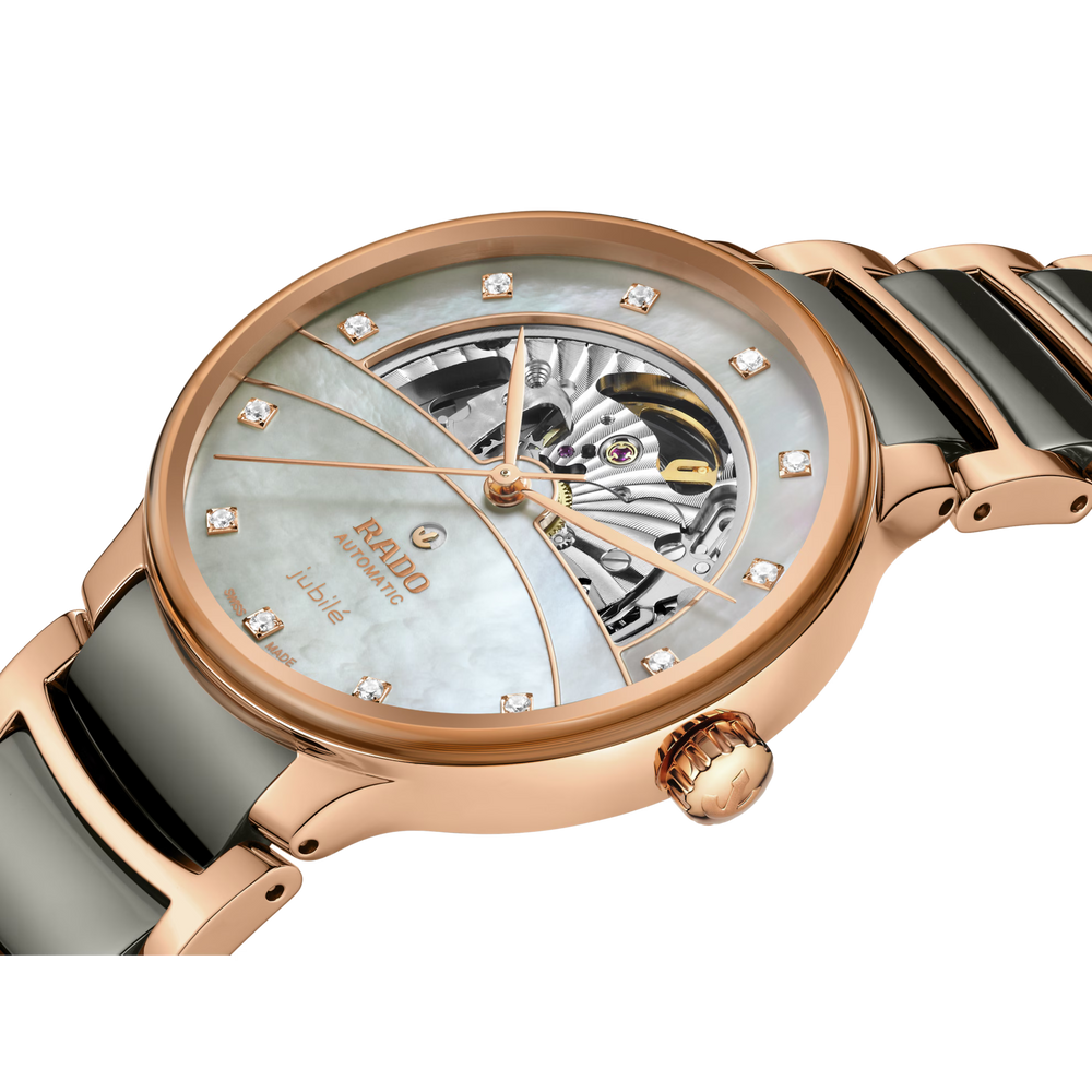 Erleben Sie mit der Rado Centrix Open Heart die harmonische Verbindung von künstlerischem Ausdruck und Design. Während die Konstellationen am Sternenhimmel ewige Geschichten schreiben, bilden die Sterne Brücken, auf denen sich Liebende treffen können. Ein grosses Fenster, das an das Firmament erinnert, auf dem sich Morgen- und Abenddämmerung abspielen, umrahmt auf wunderschöne Weise das hochmoderne Automatikwerk R734 mit einer Gangreserve von 80 Stunden und einer antimagnetischen NivachronTM Spiralfeder. Es gewährt den Blick auf das elegante „Ondulé Soleil“-Motiv, das auf der Oberfläche ausgewählter Komponenten zu sehen ist und an sich windendes Sonnenlicht erinnert. Die Optik dieses ikonischen Zeitmessers wird durch überarbeitete Bandanstösse am Gehäuse und ein Armband aus poliertem roségoldfarbenen Edelstahl mit PVD-Beschichtung und Mittelgliedern aus PlasmaHightech-Keramik abgerundet. Das Zifferblatt aus hellem silberfarbenen Perlmutt mit 12 Diamanten wird durch das per Druck aufgetragene roségoldfarbene Jubilé-Logo noch besser zur Geltung gebracht und ist perfekt auf die Zeiger abgestimmt. Die Uhr ist bis zu einer Tiefe von 50 m wasserdicht und auch in Grösse M erhältlich.