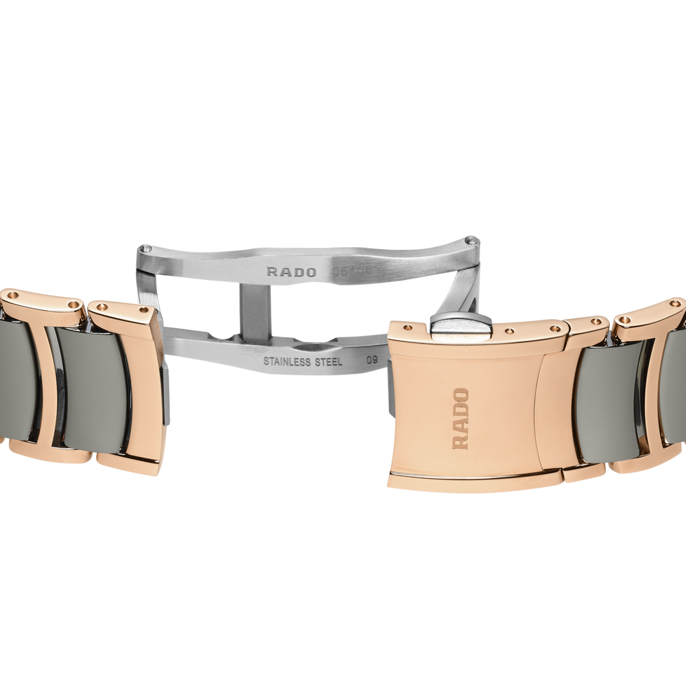 Die klassische Centrix Automatic Diamonds wurde nicht nur technisch, sondern auch ästhetisch überarbeitet. Beim neuen Modell reicht das abgerundete Saphirglas bis hin zum Rand. Außerdem geht das gewölbte Gehäuse nahtlos in den geschwungenen Kristallrand über. Die Gesamtoptik dieses ikonischen Zeitmessers wird durch überarbeitete Bandanstöße am Gehäuse und ein Armband aus poliertem roségoldfarbenen Edelstahl mit PVD-Beschichtung und Mittelgliedern aus Plasma-Hightech-Keramik abgerundet. Das silber-weisse, facettierte Zifferblatt zeichnet sich durch einen opulenten 3D-Effekt aus, der dadurch erzeugt wird, dass das Zifferblatt zunächst geprägt und die Prägung dann mit Lack gefüllt wird. Im Inneren übertrifft das mit drei Zeigern ausgestattete, in 5 statt 3 Lagen getestete Uhrwerk vom Kaliber R763 dank einer nicht-magnetischen Nivachron™ Spiralfeder die Standardtestanforderungen und sorgt für eine höhere Zuverlässigkeit und Genauigkeit. Die Uhr ist bis zu einer Tiefe von 50 m wasserdicht und bietet eine Gangreserve von 80 Stunden.