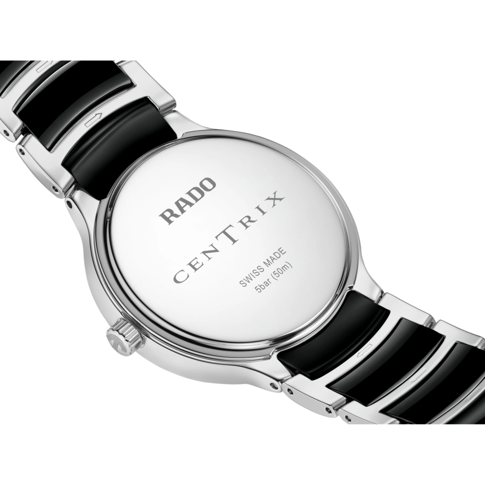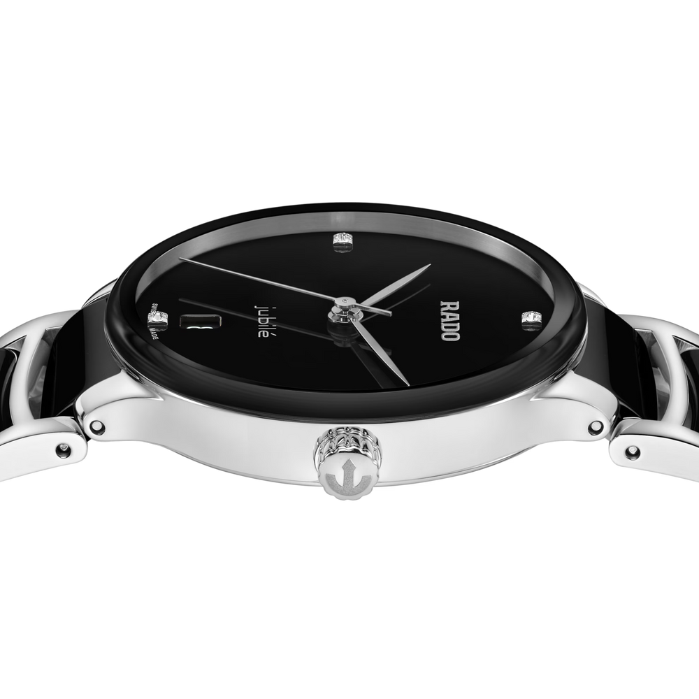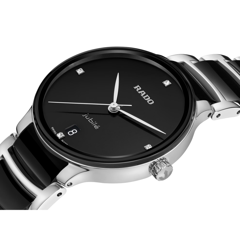Die klassische Centrix Quartz Diamonds wurde nicht nur technisch, sondern auch ästhetisch überarbeitet. Beim neuen Modell reicht das abgerundete Saphirglas bis hin zum Rand. Ausserdem geht das gewölbte Gehäuse nahtlos in den geschwungenen Kristallrand über. Die überarbeiteten Bandanstösse am Gehäuse und das Armband aus poliertem Edelstahl mit Mittelgliedern aus schwarzer Hightech-Keramik runden das Gesamtbild dieses ikonischen Zeitmessers perfekt ab. Das schwarz lackierte Zifferblatt mit 4 Diamanten wird durch das per Druck aufgetragene Jubilé-Logo noch besser zur Geltung gebracht und ist perfekt auf die rhodiumfarbenen Zeiger abgestimmt. Dank der PreciDrive- und HeavyDrive-Technologie im R073 Quarzwerk zeichnet sich die Uhr durch eine grössere Genauigkeit und Stossfestigkeit aus. Die Uhr ist bis zu einer Tiefe von 50 m wasserdicht.