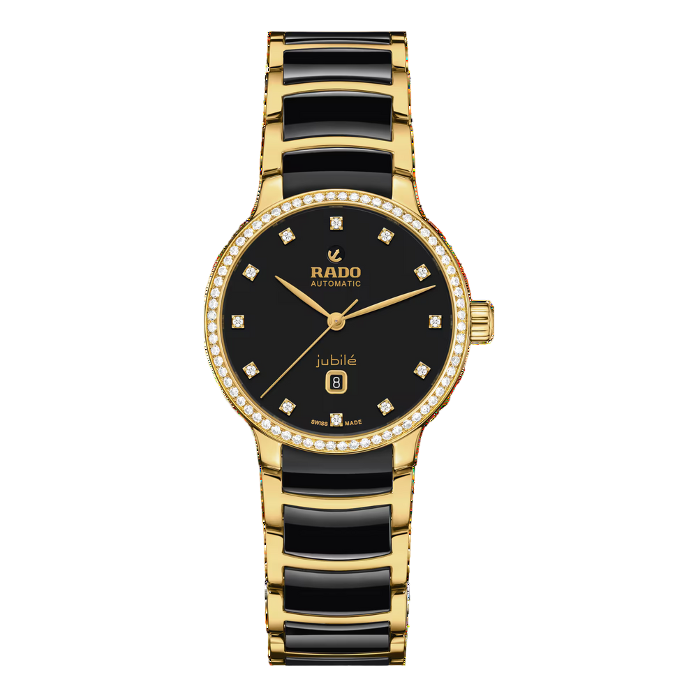 Die Centrix S Superjubilé verbindet zeitlose Eleganz mit hoher Langlebigkeit und bietet zugleich unübertroffenen Komfort und Widerstandsfähigkeit. Die Mittelglieder des Armbands aus Hightech-Keramik vereinen Leichtigkeit und Eleganz, während das Saphirglas für den nötigen Schutz sorgt. Das 30,5 mm grosse Edelstahlgehäuse ist mit einer gelbgoldfarbenen PVD-Beschichtung versehen und verleiht der Uhr eine edle Ausstrahlung. Die 68 Diamanten im Brillantschliff (Top Wesselton, VS-SI) sorgen für ein hochwertiges Finish. Auch das schwarz lackierte Zifferblatt ist mit 12 Top Wesselton Diamanten (VS-SI) besetzt und verfügt über ein Datumsfenster bei 6 Uhr sowie ein goldfarbenes Ankersymbol. Im Inneren der Centrix S Superjubilé schlägt das Automatikwerk R582, das in fünf Lagen auf seine Ganggenauigkeit getestet wurde und damit die Standard-Testanforderungen übertrifft. Die antimagnetische Nivachron™ Spiralfeder sorgt für mehr Zuverlässigkeit. Ein Edelstahlarmband mit gelbgoldfarbener Beschichtung und Mittelgliedern aus schwarzer Hightech-Keramik vervollständigt das elegante Design. Das Armband wird mit einer Dreifachschliesse aus Edelstahl geschlossen.