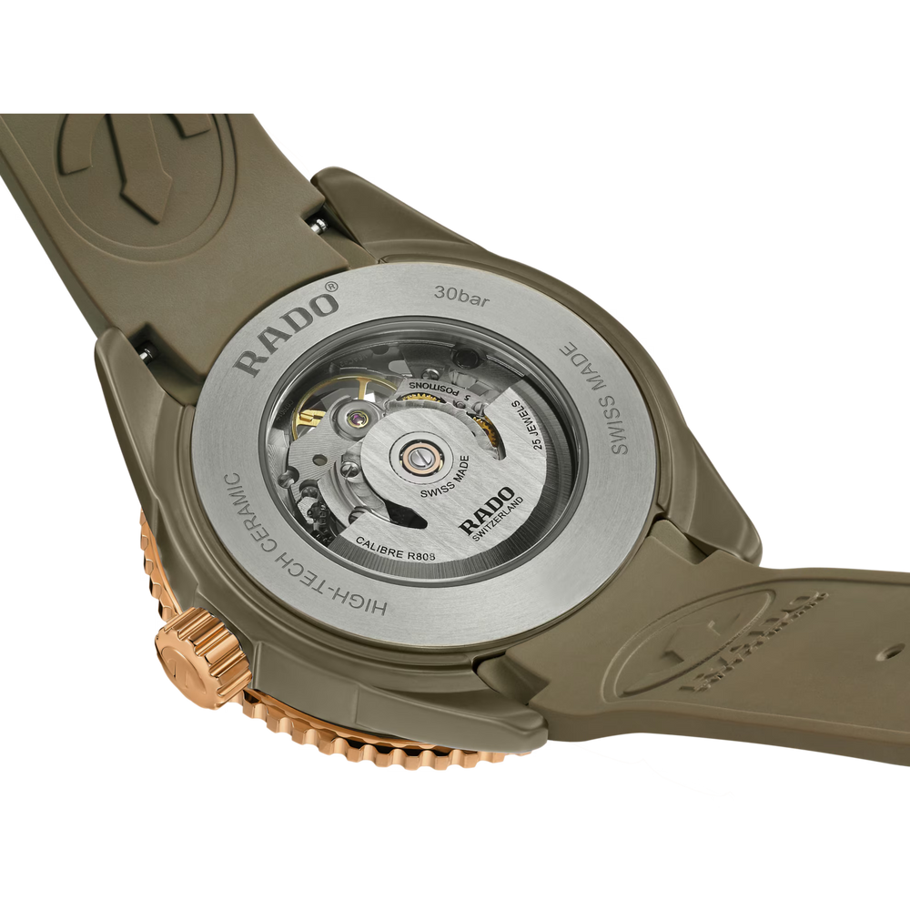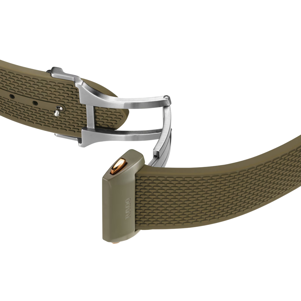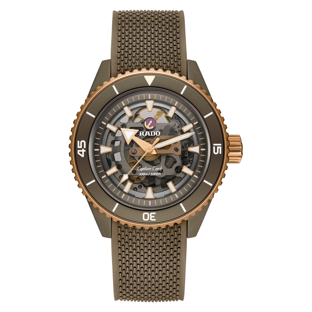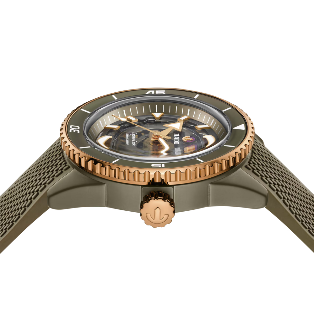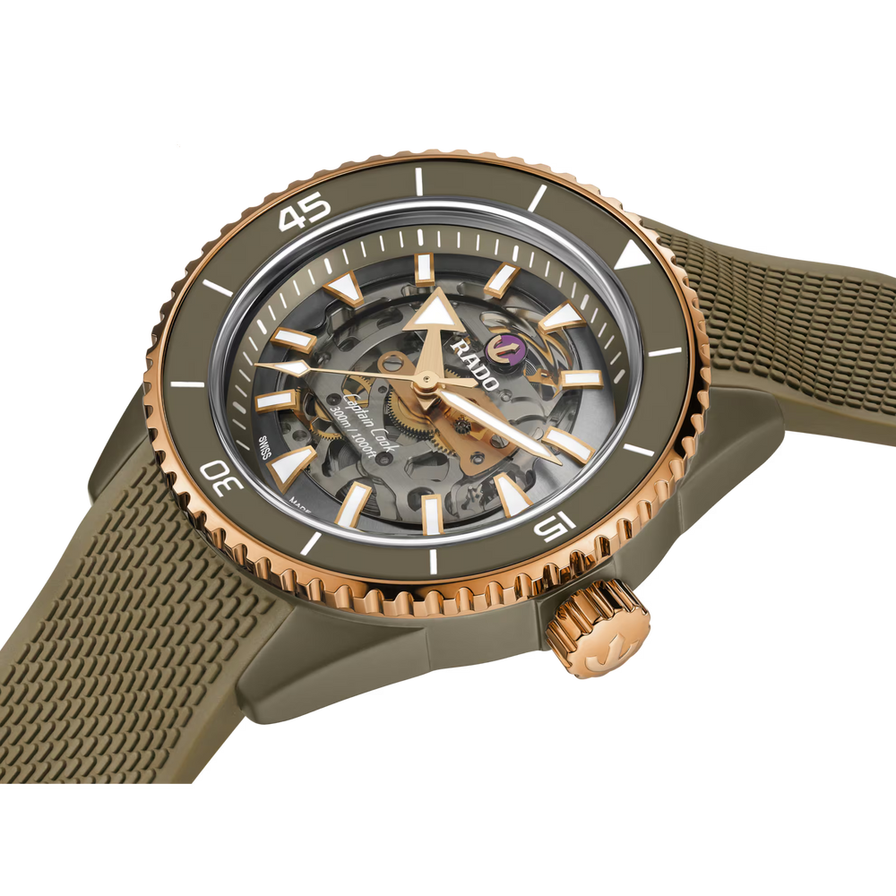 Die Captain Cook High-Tech Ceramic Skeleton stellt ihr innovatives R808 Uhrwerk zur Schau – ein Wunderwerk aus Kontrasten, Know-how und intelligenter Geometrie, das einen klaren Blick auf die verschiedenen Bauteile gewährt. Die Uhr ist mit einer antimagnetischen und höchst zuverlässigen NivachronTM Spiralfeder ausgestattet, die in fünf Lagen getestet wurde und eine Gangreserve von bis zu 80 Stunden bietet. Ihr edles Monobloc-Gehäuse aus Hightech-Keramik in Olivgrün wird durch eine roségoldfarbene drehbare Lünette mit einem olivgrünen Keramikeinsatz abgerundet – farblich perfekt und optisch absolut harmonisch auf Gehäuse und Bandanstöße abgestimmt. Das Zifferblatt ist klar und minimalistisch gestaltet und verfügt über markante geometrische Indizes und Zeiger in Roségoldtönen, die dank Beschichtung mit weissem Super-LumiNova® auch bei schlechten Lichtverhältnissen bestens abgelesen werden können. Mit ihrem farblich abgestimmten Armband aus olivgrünem Kautschuk und ihrer Schliessenabdeckung aus Hightech-Keramik zeigt die neue Captain Cook ihre sportliche Seite.