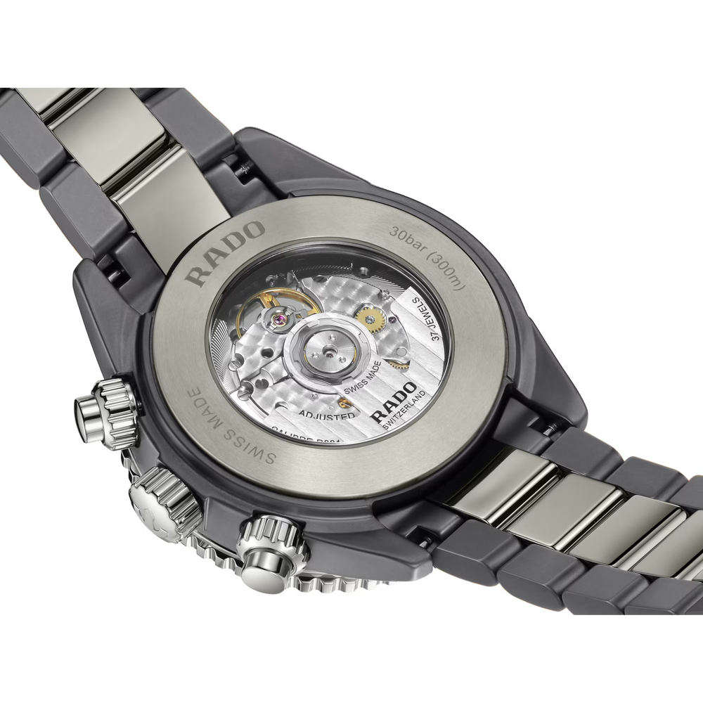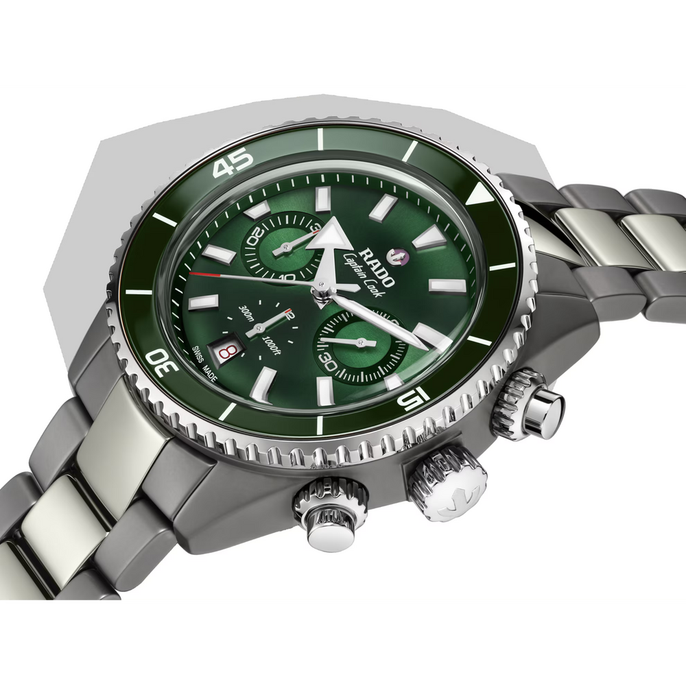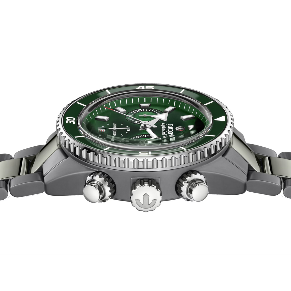 Der Captain Cook High-Tech Ceramic Chronograph ist das Ergebnis präziser Fertigungsprozesse und fortschrittlicher Materialtechnologie. Er wurde mit höchster Präzision gefertigt. Unter hohem Druck, extremer Hitze und mit technischer Präzision gefertigt, setzt die Konstruktion neue Massstäbe in der modernen Uhrmacherei. Das 43 mm grosse Monobloc-Gehäuse besteht aus Plasma Hightech-Keramik, einem Material, das durch einen extremen Umwandlungsprozess entsteht, bei dem weisse Keramik aktivierten Gasen bei 20.000 °C ausgesetzt wird. In dieser glühenden Umgebung verändert sich die Molekularstruktur des Materials so, dass die Oberfläche einen unverwechselbaren metallischen Glanz erhält – ganz ohne Metallpartikel. Dieses Meisterwerk moderner Materialwissenschaft verfügt zudem über eine drehbare Edelstahl-Lünette mit poliertem, grünem Keramikeinsatz und gravierten Markierungen mit weissem Super-LumiNova®.