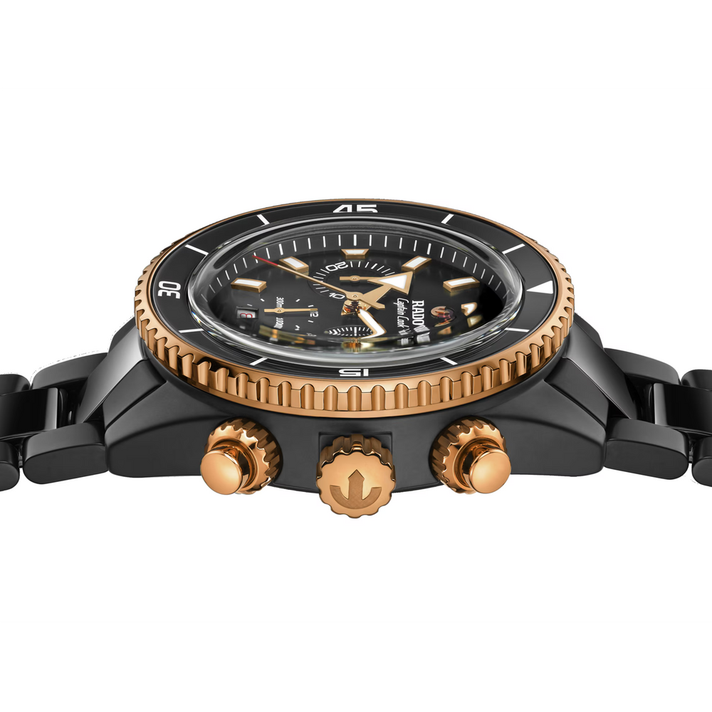 Der Captain Cook High-Tech Ceramic Chronograph vereint modernste Materialinnovationen mit höchster Fertigungspräzision - das Resultat kompromissloser Technik auf höchstem Niveau. Unter enormem Druck, extremer Hitze und mit technischer Meisterschaft geformt, überwindet seine Konstruktion die bisherigen Grenzen moderner Uhrmacherkunst. Das 43 mm grosse Monobloc-Gehäuse aus mattschwarzer Hightech-Keramik hat eine drehbare Lünette aus roségoldfarben PVD-beschichtetem Edelstahl. Der Einsatz aus polierter schwarzer Hightech-Keramik ist mit gravierten weissen Super-LumiNova®-Markierungen versehen. Das bei über 2.000 °C hergestellte, beidseitig entspiegelte Saphirglas im Box-Shape-Stil bietet eine aussergewöhnliche Klarheit und eine Kratzfestigkeit, die nur von Diamanten übertroffen wird.