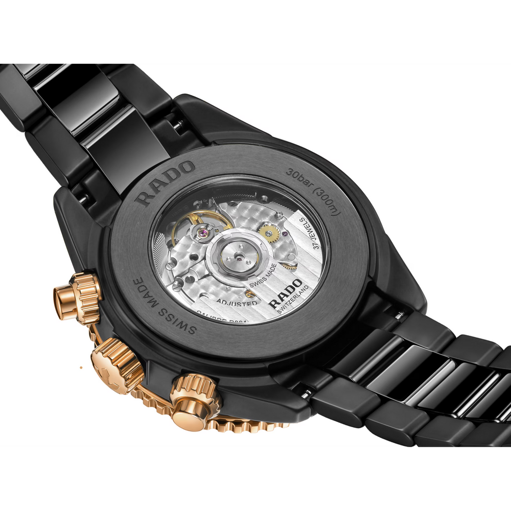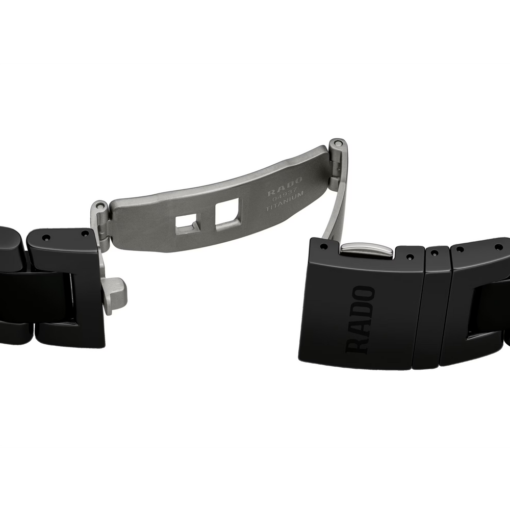 Herzstück der Uhr ist das Chronographenwerk R801 mit Automatikaufzug, das für kompromisslose Zuverlässigkeit entwickelt wurde. Das Uhrwerk mit 37 Lagersteinen wurde in fünf Positionen getestet und garantiert auch unter schwierigsten Bedingungen eine präzise Zeitmessung. Es ist mit einer antimagnetischen Nivachron™ Spiralfeder ausgestattet. Mit einer Gangreserve von 59 Stunden ist das Chronographenwerk R801 ein Beispiel für technische Meisterschaft und mechanische Robustheit. Es verkörpert Schweizer Ingenieurskunst und das kontinuierliche Streben von Rado nach uhrmacherischer Exzellenz.