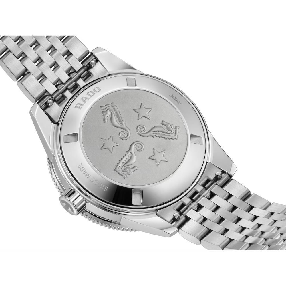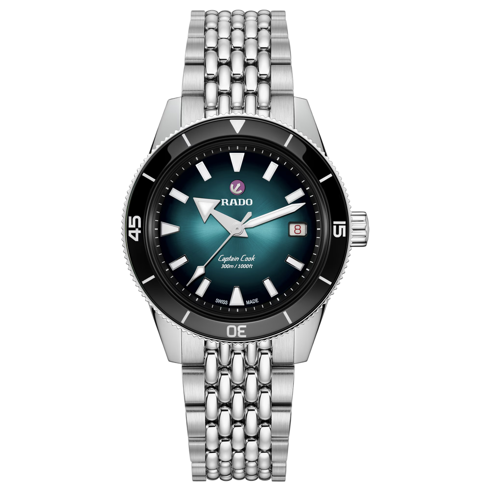 Ein Armband aus poliertem und satiniertem Edelstahl in Reiskorn-Optik rundet das Design ab und sitzt dank einer Dreifach-Faltschliesse aus Edelstahl sicher am Handgelenk. Die bis 30 bar (300 m) wasserdichte Captain Cook ist bereit für jedes Abenteuer und verbindet Schweizer Präzision mit zeitgemässer Eleganz.