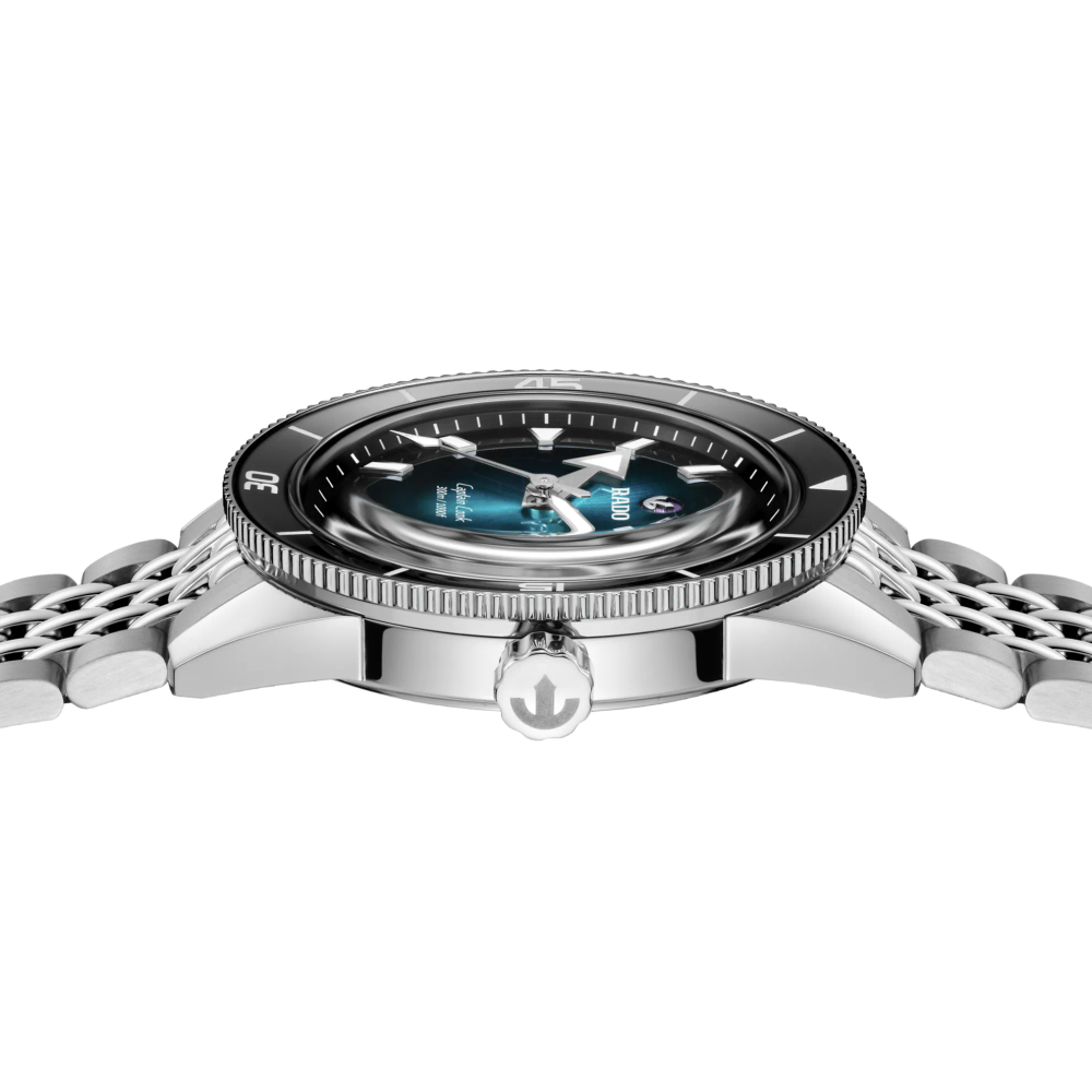Die Captain Cook vereint Präzision und Stil – perfekt für alle, die von ihrem Zeitmesser in jeder Situation absolute Leistung erwarten. Das 39-mm-Gehäuse aus poliertem Edelstahl ist mit einer drehbaren Lünette aus dem gleichen Material sowie mit einem schwarzen Keramikeinsatz mit gravierten weissen Markierungen und einem Dreieck mit weissem Super-LumiNova® versehen. Das bei über 2.000 °C hergestellte, beidseitig entspiegelte Saphirglas im Box-Shape-Stil bietet eine aussergewöhnliche Klarheit und eine Kratzfestigkeit, die nur von Diamanten übertroffen wird.