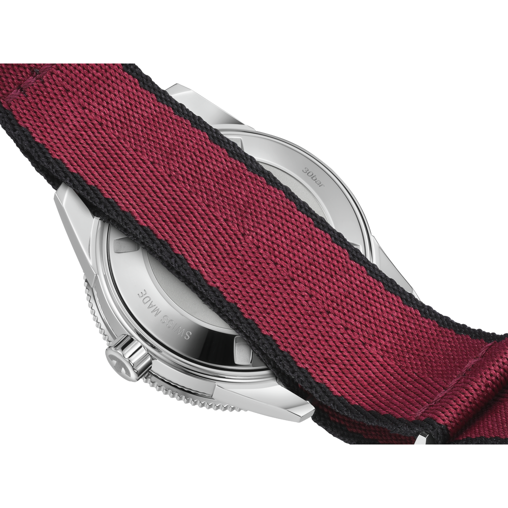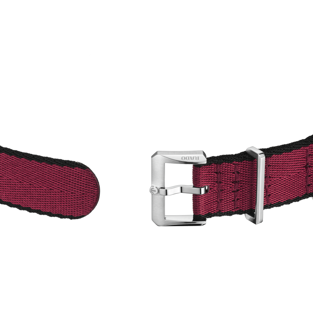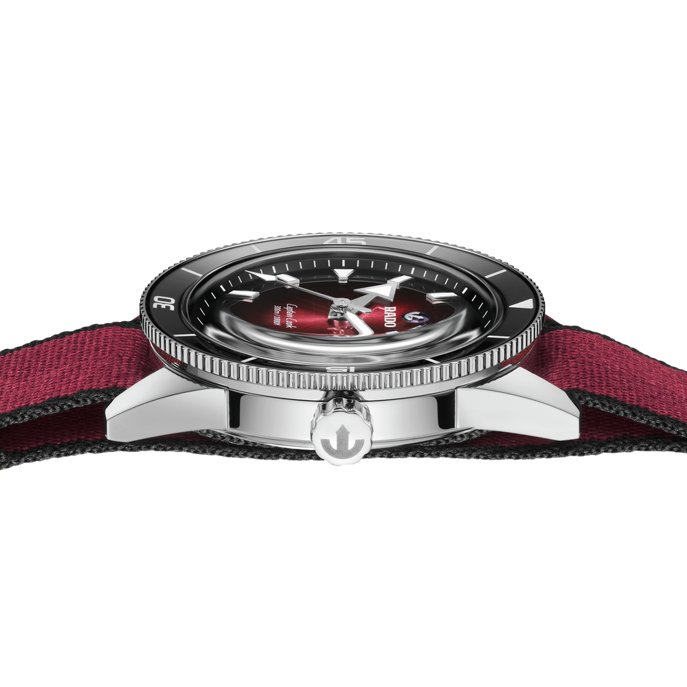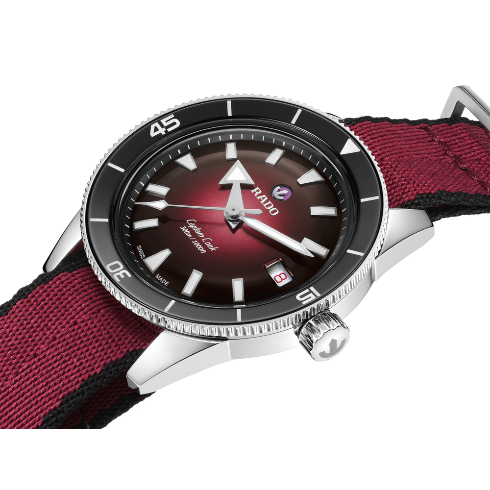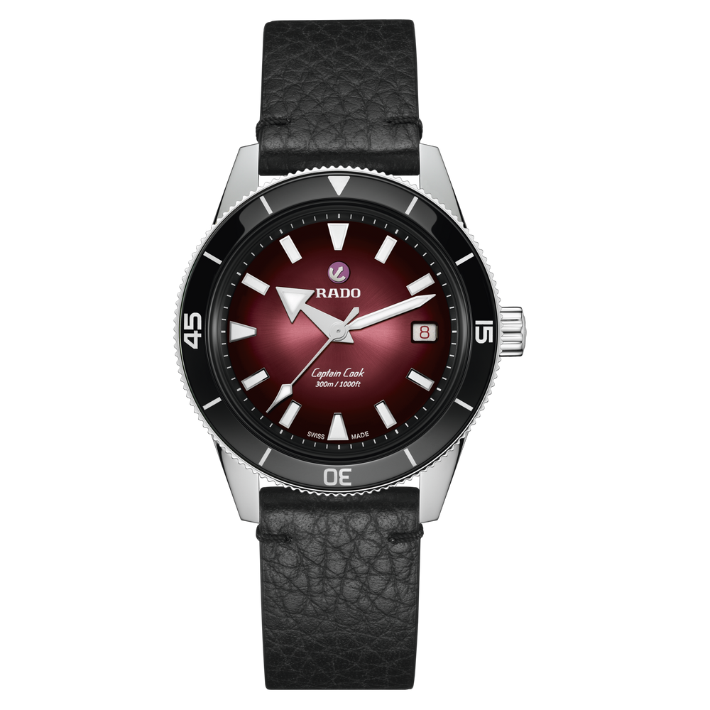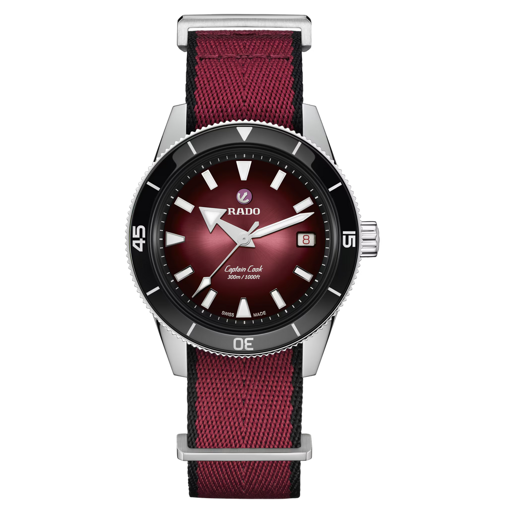 Diese faszinierende Captain Cook wurde von der Originalausgabe aus dem Jahr 1962 inspiriert und besticht durch ihr Zifferblatt mit Farbverlauf von Schwarz zu Burgunderrot, das schimmernd unter einem Saphirglas im Box-Shape-Stil liegt. Noch betont wird die augenfällige Optik durch rhodinierte Indizes und Zeiger mit Super-LumiNova und den polierten schwarzen Lünetteneinsatz aus der markeneigenen Hightech-Keramik von Rado. Angetrieben wird die Uhr vom Rado Kaliber R763, einem Automatikwerk mit 25 Steinen und drei Zeigern, das mit seiner antimagnetischen Nivachron Spiralfeder für mehr Zuverlässigkeit und Genauigkeit sorgt. Das wasserdichte Gehäuse aus Edelstahl mit einem Durchmesser von 39 mm und einer Wasserdichtigkeit von 30 bar (300 m) komplementiert die bestehenden Gehäusegrössen von 37 mm und 42 mm. Damit hat die Captain Cook Reihe jetzt für Handgelenke jeder Grösse ein passendes Modell zu bieten. Am Handgelenk befestigt wird die Uhr mit einem Edelstahlarmband mit Reiskorn-Optik im Vintage-Stil – perfekt für klassische Anlässe. Dieses lässt sich zudem leicht gegen zwei zusätzliche Armbänder austauschen: ein burgunderrotes NATO-Textilarmband mit schwarzem Rand und ein schwarzes Lederarmband. Mit seinem satten Farbton ist dieser robuste und zuverlässige Zeitmesser der perfekte Begleiter für aktive Abenteurer.