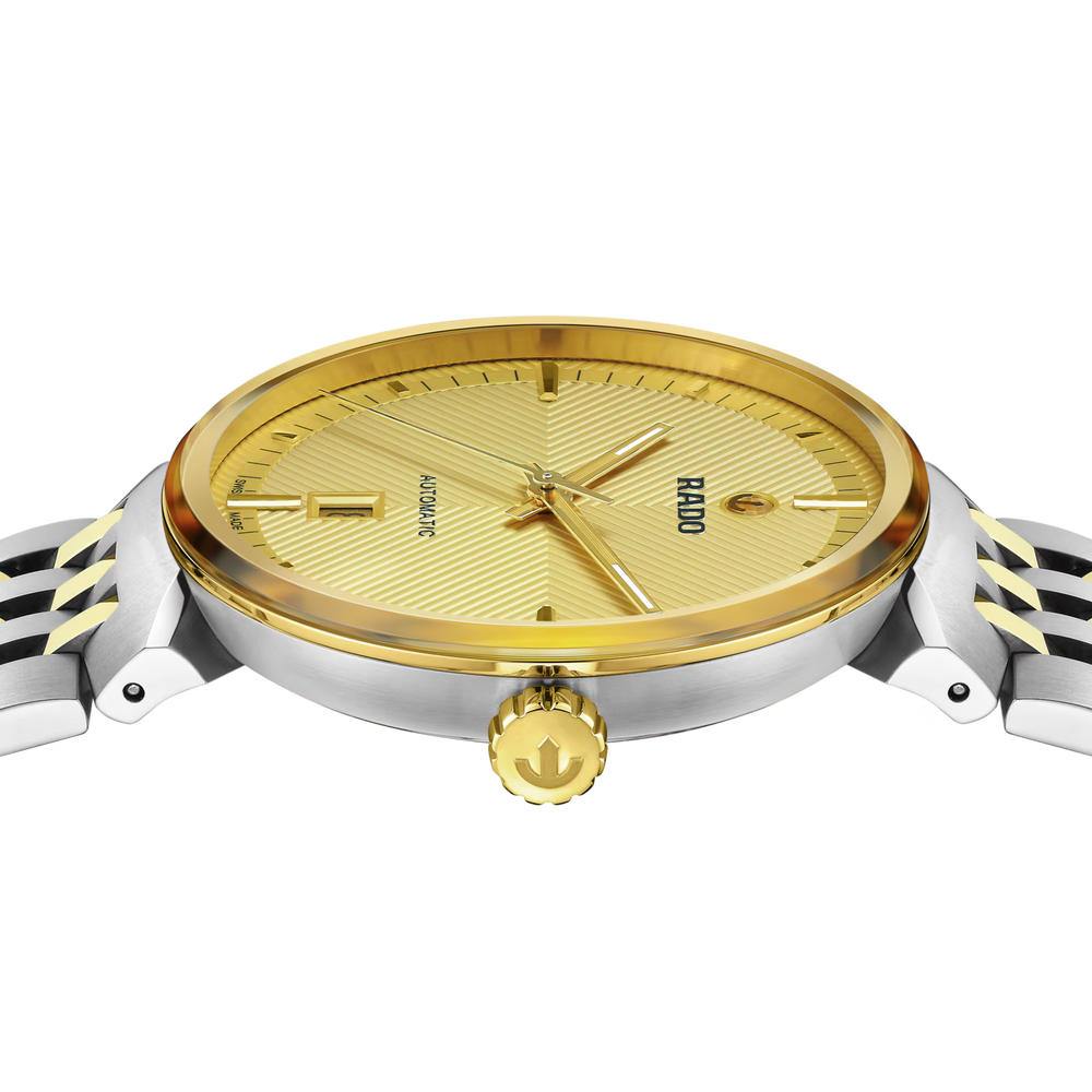 Das gelbgoldfarbene Zifferblatt mit seinem eleganten Prägemuster dient als Theaterkulisse und zeugt von viel Liebe zum Detail. Die gelbgoldfarbenen Indizes und das bewegliche Rado Ankersymbol mit gebürstetem und poliertem Finish harmonieren perfekt mit dem gelbgoldfarbenen Hintergrund.