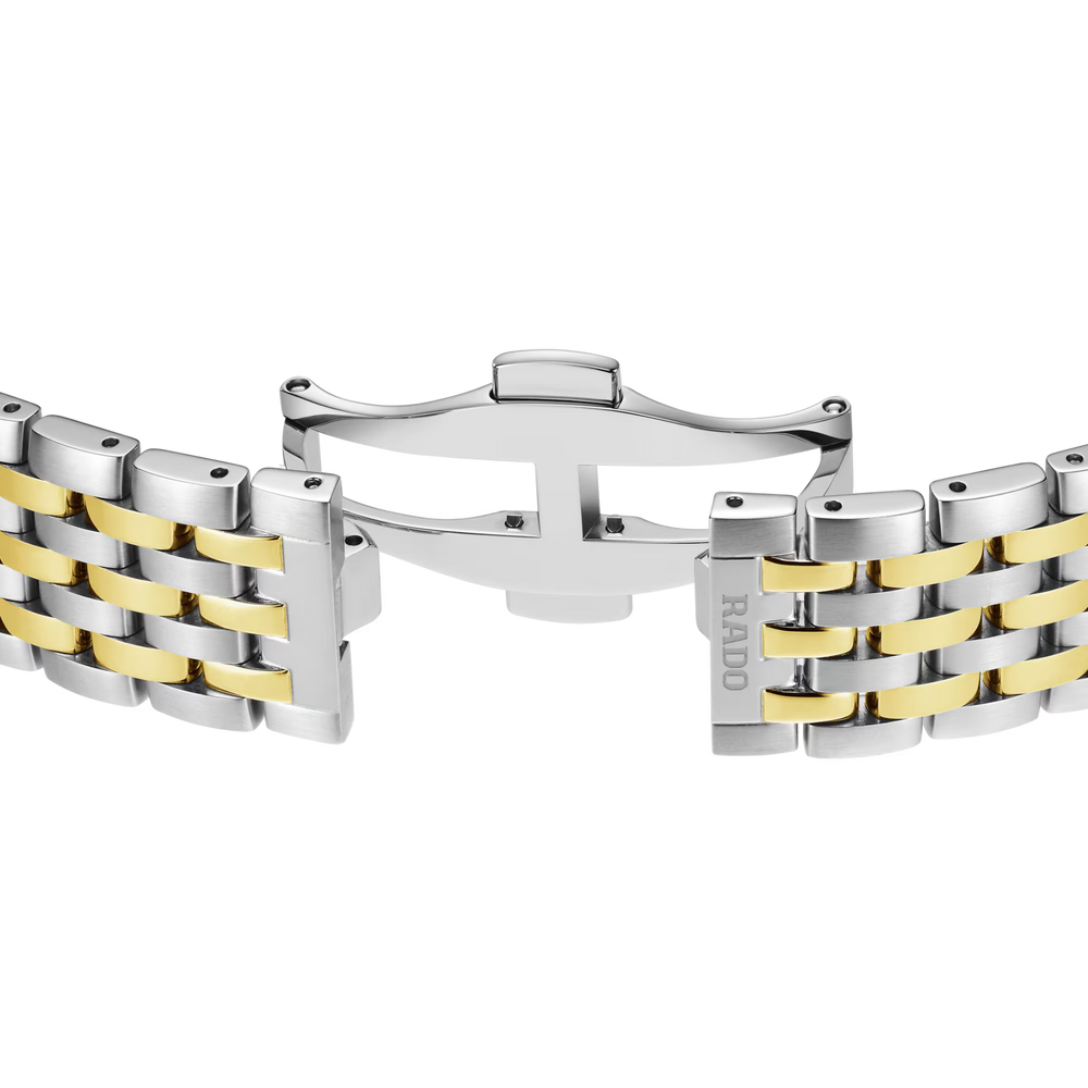 Abgerundet wird das Gehäuse durch ein zweifarbiges Armband, das Glieder aus poliertem gelbgoldfarbenen PVD-Edelstahl mit Gliedern aus gebürstetem Edelstahl kombiniert und mit einer Dreifachschliesse aus Edelstahl am Handgelenk gesichert wird. Unter dem Gehäuseboden aus Saphirglas im Box-Shape-Stil verbirgt sich die Seele der Florence: das Automatikwerk Kaliber R763. Das in fünf Lagen fein justierte Uhrwerk mit einer Nivachron™ Spiralfeder bietet eine hohe Ganggenauigkeit und eine robuste Gangreserve von 80 Stunden. Dies unterstreicht den hohen Stellenwert, den Rado der Perfektion beimisst.