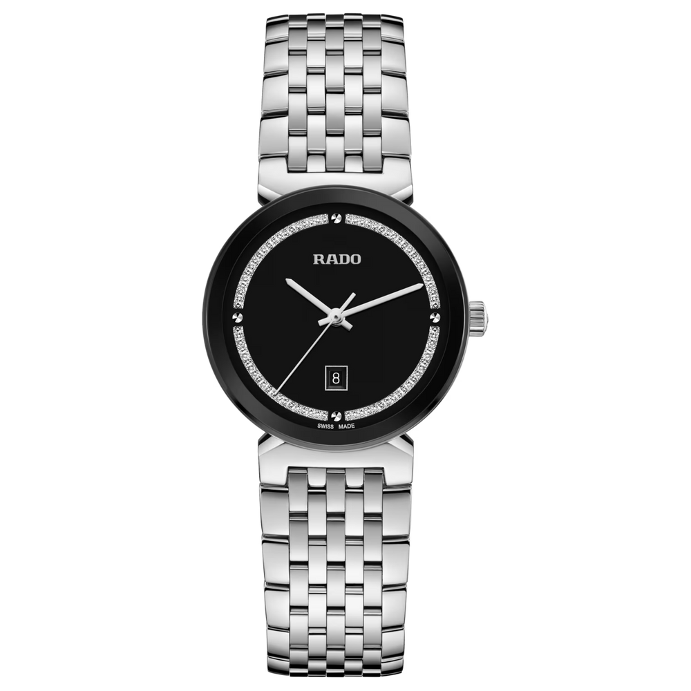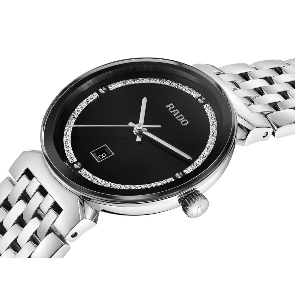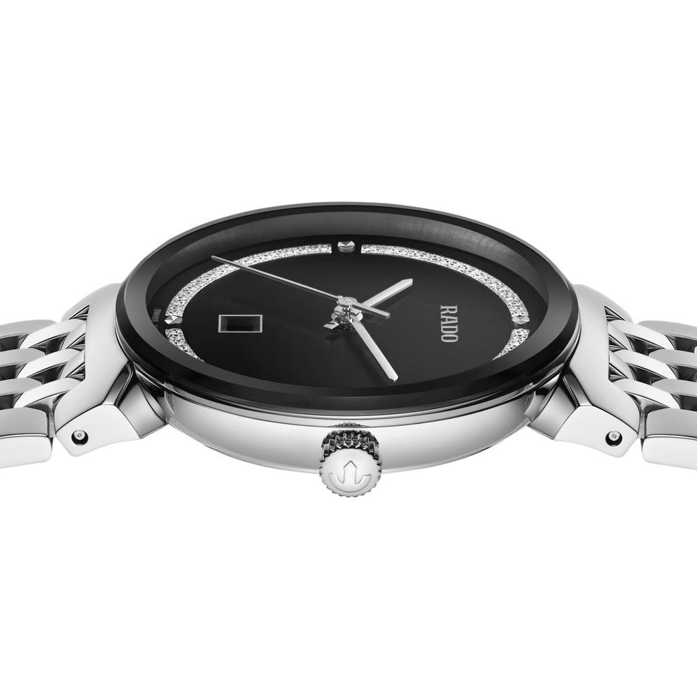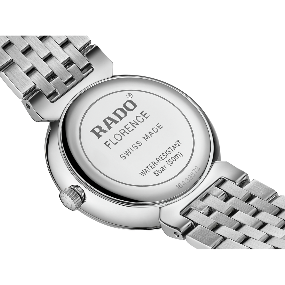 Das harmonische Design der Rado Florence erinnert an die eleganten Kuppeln und Türme der Stadt, der die Kollektion ihren Namen verdankt. Das Modell wir von dem zuverlässigen Rado Quarzwerk Kaliber R079 mit drei Zeigern angetrieben, das eine besonders hohe Genauigkeit und Stossfestigkeit garantiert. Die 30 mm grosse Uhr verfügt über ein gewölbtes Saphirglas mit abgeschrägten Kanten, das von Rand zu Rand reicht. Gehäuse, Krone, Lünette und Gehäuseboden des Modells sind aus poliertem Edelstahl gefertigt. Ein Armband aus poliertem Edelstahl rundet die klassische Optik des Zeitmessers ab. Das schwarze Zifferblatt mit dekorativem rhodiumfarbenem Glitzereffekt ist farblich perfekt auf die ebenfalls rhodiumfarbenen Zeiger abgestimmt und wird durch das silberfarbene Rado-Logo noch betont. Die Uhr ist bis zu einer Tiefe von 50 m wasserdicht und auch in Grösse L erhältlich – damit eignet sie sich perfekt als Paar-Uhr.