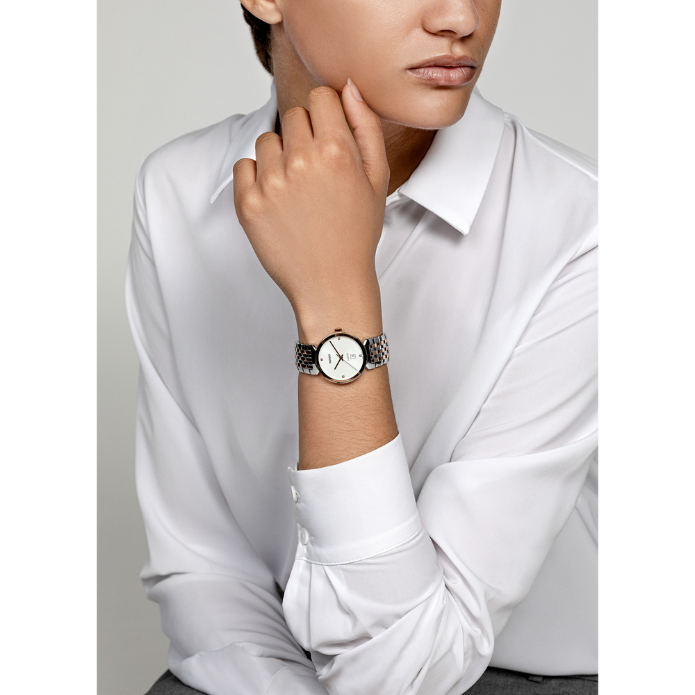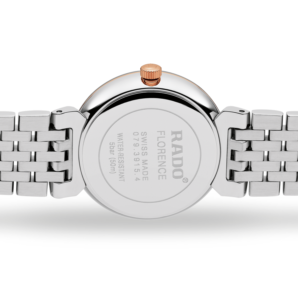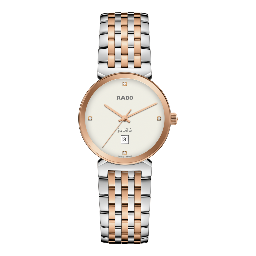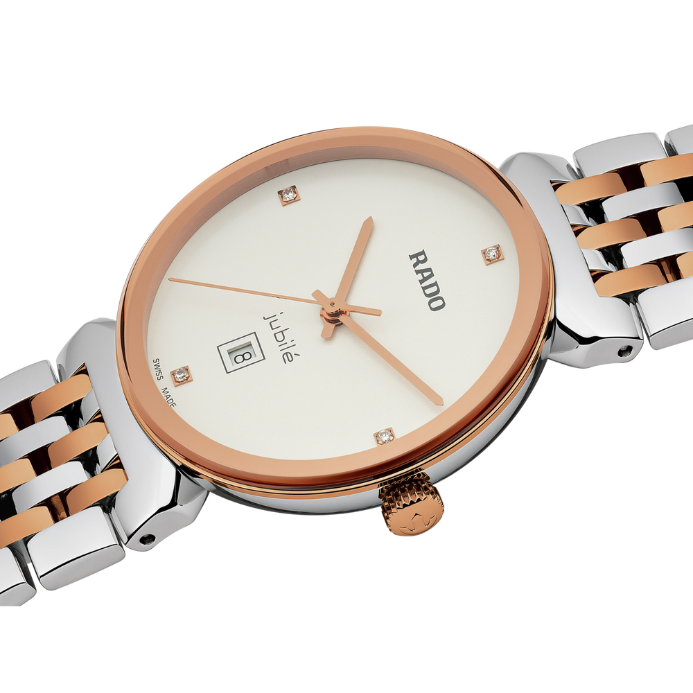Das harmonische Design der Rado Florence ruft einem die eleganten Kuppeln und Türme der Stadt in Erinnerung, der die Kollektion ihren Namen zu verdanken hat. Mit ihren hochwertigen Quarzuhrwerken, Rados innovativem metallisierten Saphirglas und dem unvergänglichen Reiz der Diamanten überdauern diese Schweizer Stücke garantiert die Zeit. Rhodinierte Zeiger gleiten über vier Brillantschliff-Diamanten, die bei 3, 6, 9 und 12 Uhr als Indizes gesetzt sind. Ihre funkelnde Präsenz wird in der neuen Florence Classic Kollektion durch die Rückkehr des Jubilé-Logos noch unterstrichen.