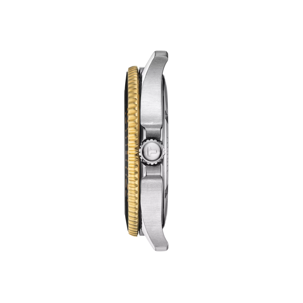Vom ersten Blick bis zum täglichen Gebrauch – die Seastar 1000 Quartz 40mm steht für Stil, Leistung und Vielseitigkeit. Jedes Modell ist eine harmonische Verbindung von Eleganz und Technologie, die das Know-how der Schweizer Uhrmacherkunst mit immerwährendem Design vereint. Die vielseitige Gehäusegröße wurde für all jene entwickelt, die nach einer modernen, geschmackvollen Uhr suchen, die sich den ganzen Tag lang tragen lässt und außergewöhnliche technische Leistungsfähigkeit verspricht. Wie auch die 36 und 45,5 mm messenden Seastar Modelle verdankt diese Uhr ihren Namen der Wasserdichtigkeit bis zu einem Druck von 30 bar (300 m), was 1.000 Fuß entspricht. Die Seastar bietet eine einseitig drehbare Lünette für zuverlässige Zeitmessung unter Wasser, und dank der Verwendung von Super-LumiNova® Leuchtbeschichtung auf den Zeigern und Stundenmarkierungen ist die Ablesbarkeit auch bei schlechten Lichtverhältnissen gegeben. Tissots benutzerfreundliches Schnellwechselsystem erlaubt den einfachen Austausch von Armbändern, die der Besitzer aus einer breiten Palette kompatibler Tissot Armbänder auswählen kann. Damit lässt sich die Seastar je nach Stimmung oder Anlass personalisieren.