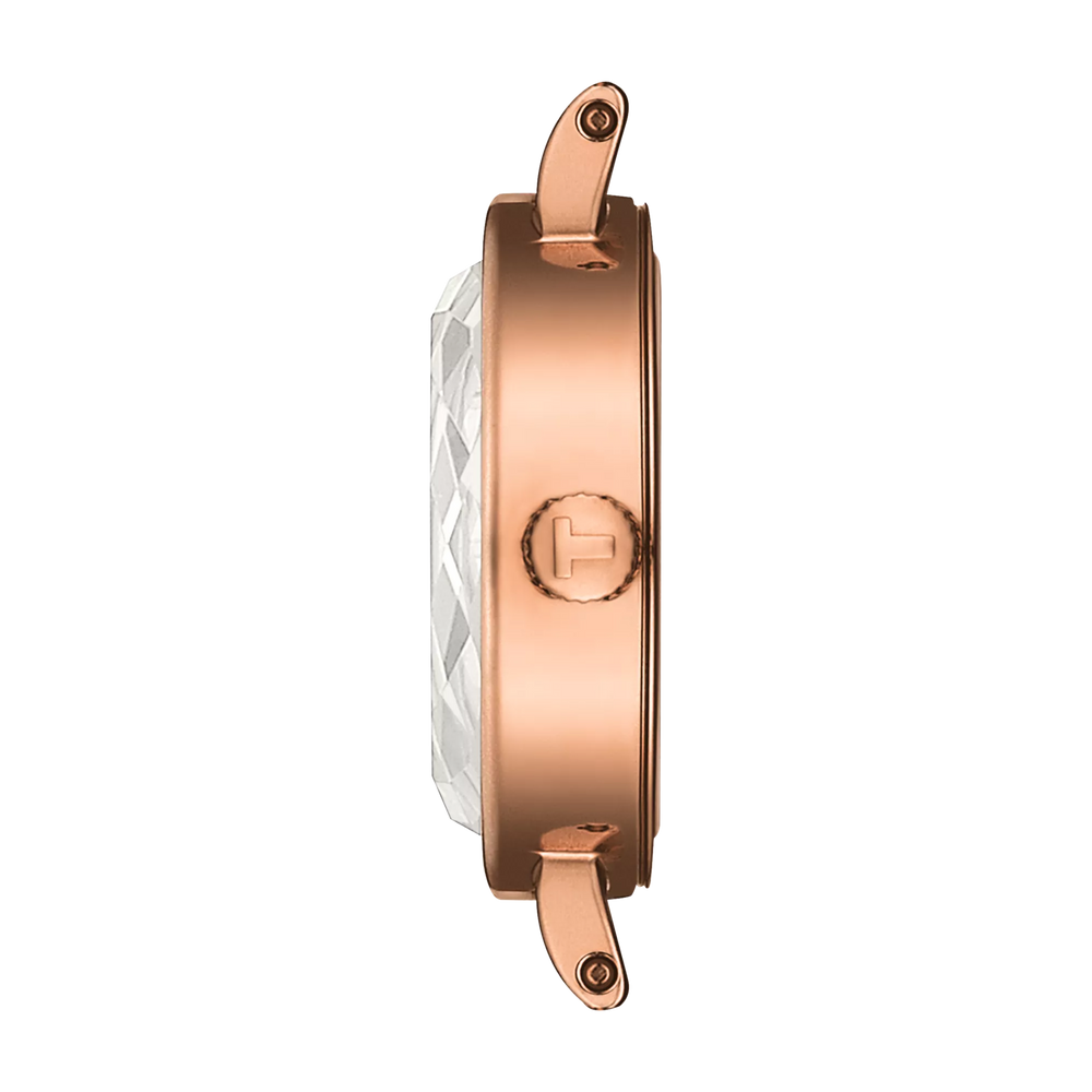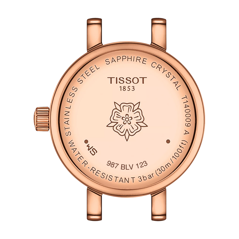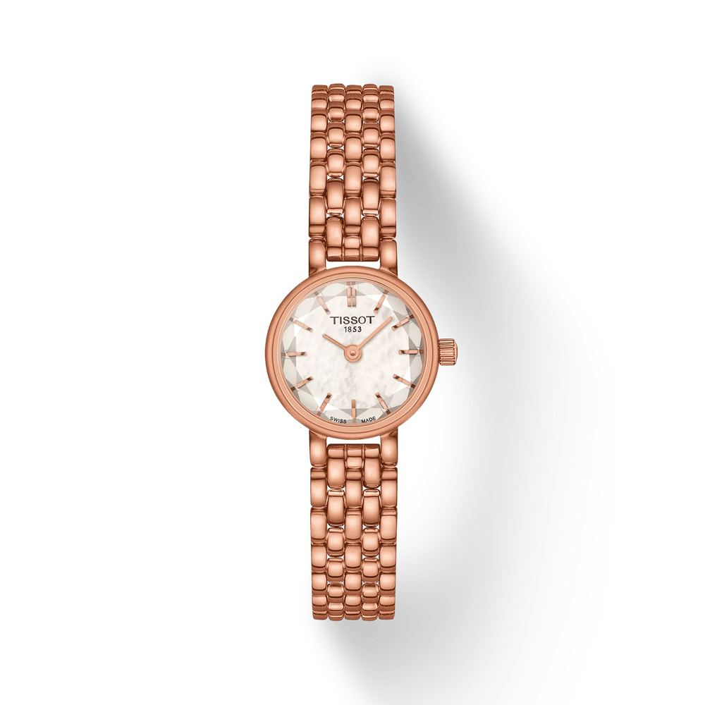 Die Tissot Lovely kleidet raffinierte Eleganz in zeitloses Design. Locker am Handgelenk getragen, wirkt sie wie ein atemberaubendes Schmuckstück.Alle Tissot Lovely Uhren verfügen über kratzfestes Saphirglas und werden von einem präzisen Swiss Made Quarzwerk angetrieben, damit Sie Tag und Nacht mit der Zeit Schritt halten können.Dieses Tissot Lovely Round Modell besitzt ein 316L-Edelstahlgehäuse mit roségoldfarbener PVD-Beschichtung, ein am äußeren Rand umlaufend facettengeschliffenes Saphirglas sowie ein weißes Perlmuttzifferblatt. Das 316L-Edelstahlarmband mit roségoldfarbener PVD-Beschichtung verfügt über eine Butterfly-Faltschließe mit Drückern.