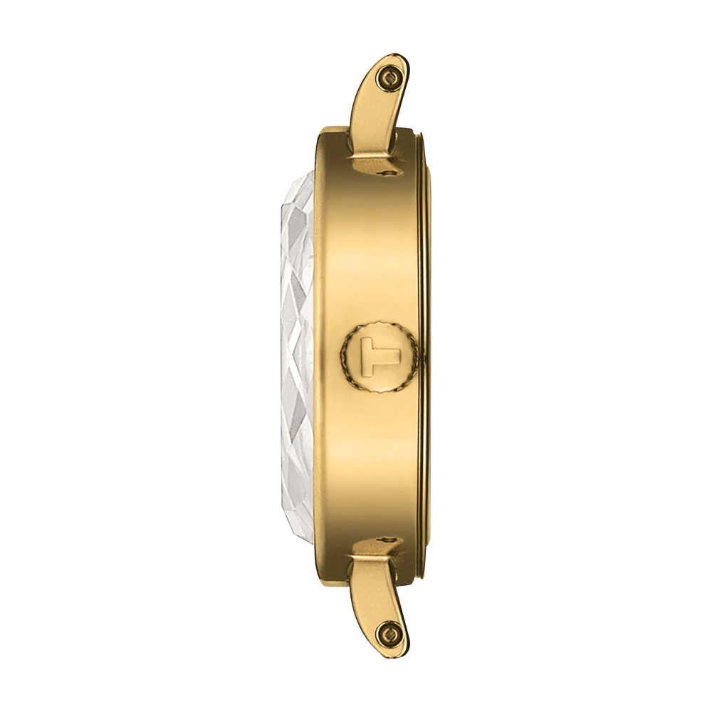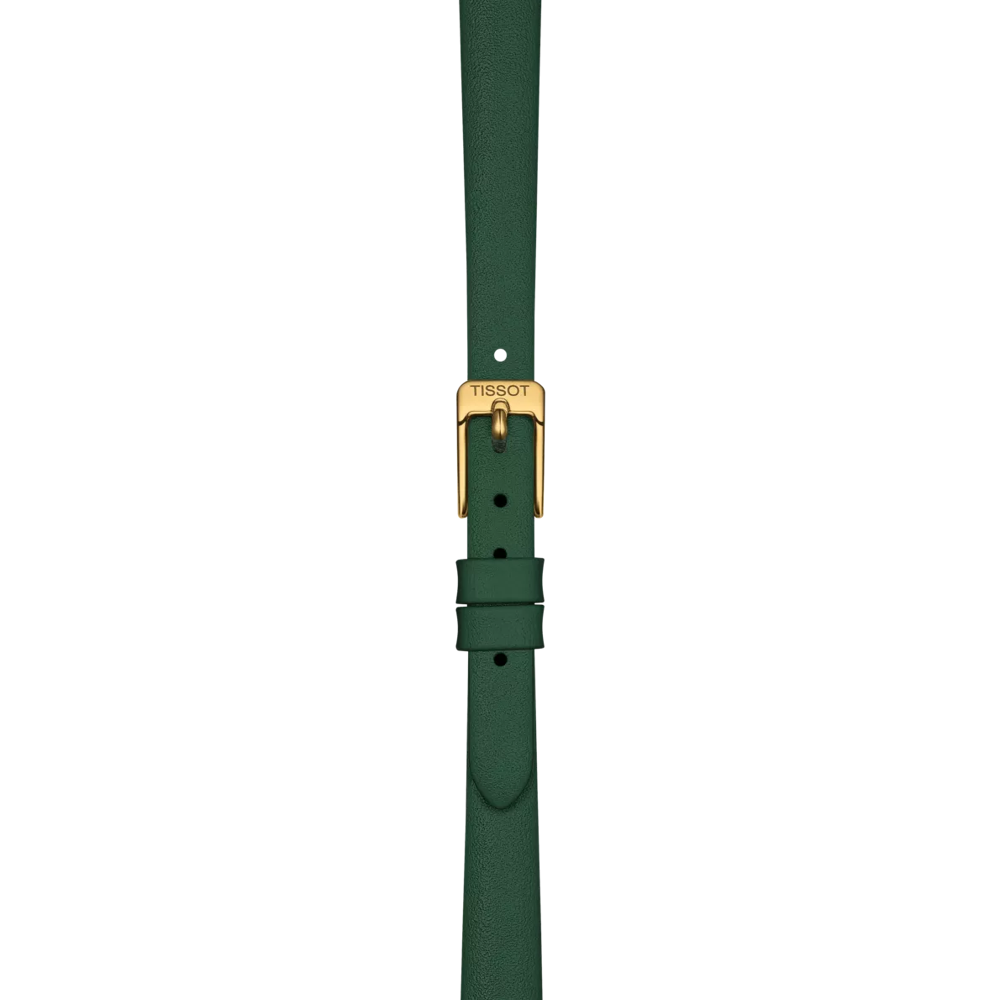 Die Tissot Lovely kleidet raffinierte Eleganz in zeitloses Design. Locker am Handgelenk getragen, wirkt sie wie ein atemberaubendes Schmuckstück.Alle Tissot Lovely Uhren verfügen über kratzfestes Saphirglas und werden von einem präzisen Swiss Made Quarzwerk angetrieben, damit Sie Tag und Nacht mit der Zeit Schritt halten können.Dieses Tissot Lovely Round Modell besitzt ein 316L-Edelstahlgehäuse mit gelbgoldfarbener PVD-Beschichtung, ein am äußeren Rand umlaufend facettengeschliffenes Saphirglas sowie ein grünes Zifferblatt. Das grüne Lederarmband verfügt über eine Dornschließe.