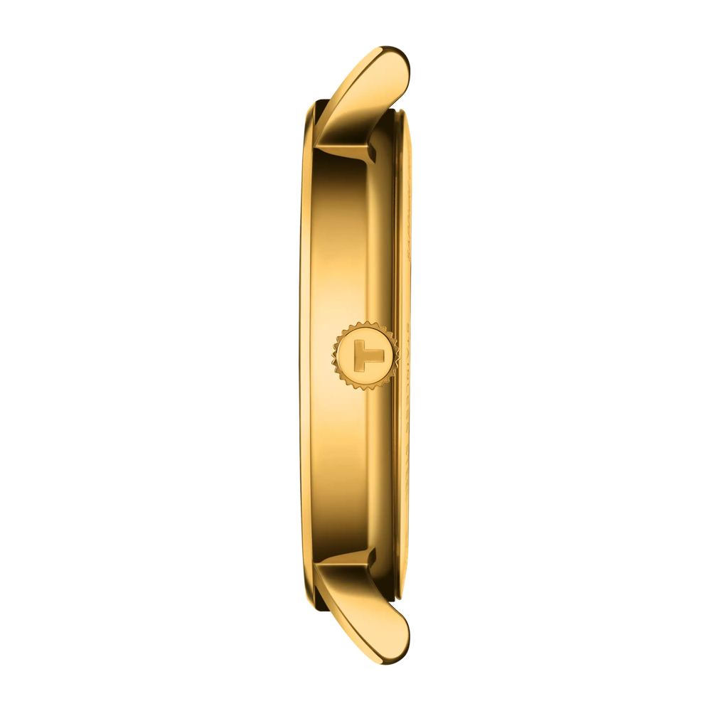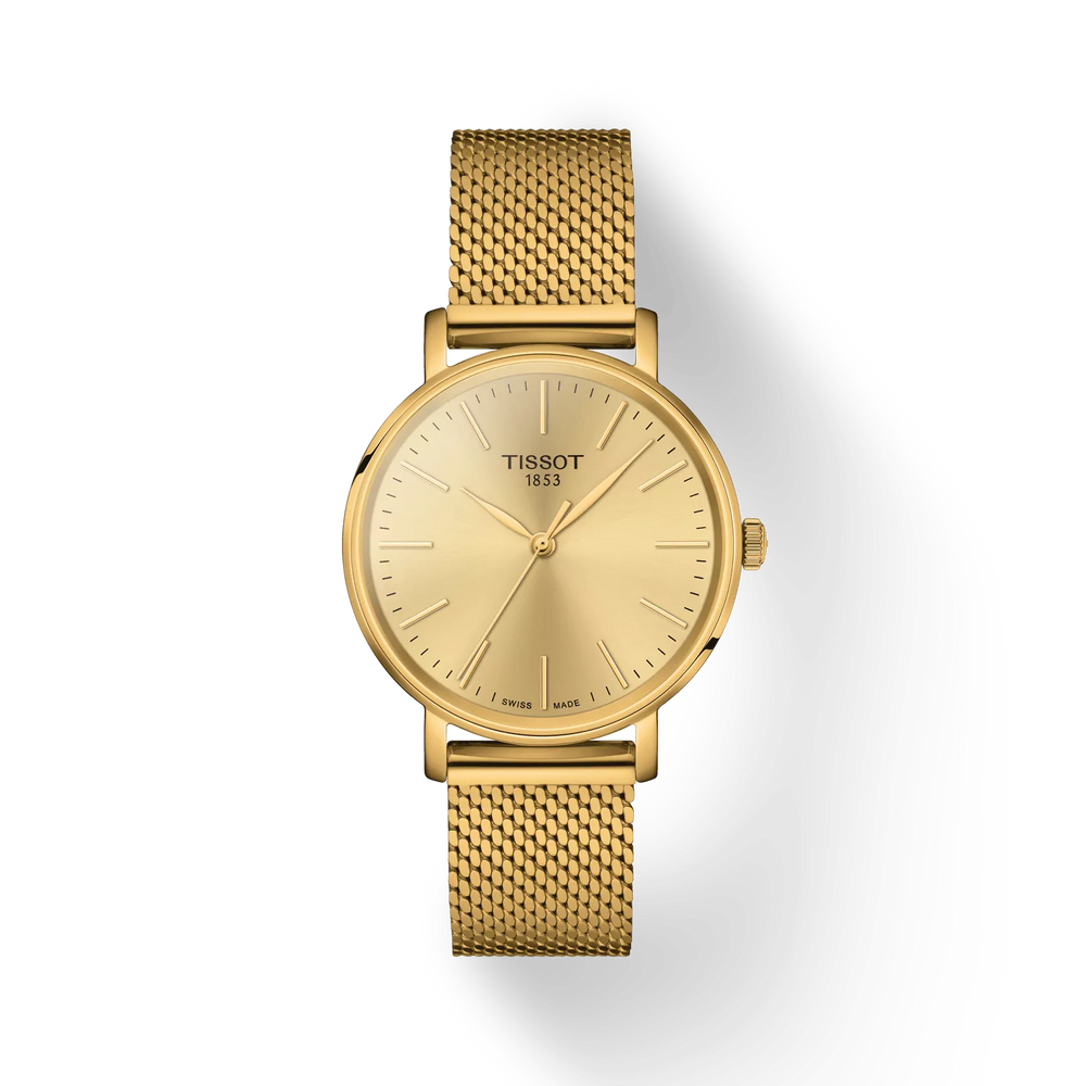 Der Name der Tissot Everytime ist Programm: diese Uhr passt immer und zu jedem Anlass. Mit der Everytime stellt Tissot eine Uhr vor, die dank ihres minimalistischen, klaren und zeitlosen Designs jedem Lebensstil und jedem Outfit gerecht wird. Sie besitzt ein sehr attraktives Preis-Leistungs-Verhältnis und spricht mit ihrer puristischen Optik Frauen und Männer gleichermaßen an.Alle Ausführungen dieser präzisen, zuverlässigen Swiss Made Quarzuhr verfügen über ein robustes 316L-Edelstahlgehäuse sowie hochwertiges, kratzfestes Saphirglas und sind mit einer Endanzeige der Batterielebensdauer ausgestattet. Verschiedene Armbänder bilden die perfekte Ergänzung und verleihen jeder Tissot Everytime einen ganz eigenen Look.Dieses Modell der Tissot Everytime Lady Kollektion besitzt ein 316L-Edelstahlgehäuse mit gelbgoldfarbener PVD-Beschichtung, ein champagnerfarbenes Zifferblatt und ein fein gearbeitetes Milanaise-Armband mit Schnellwechselsystem und Schmuckschließe mit Sicherung.