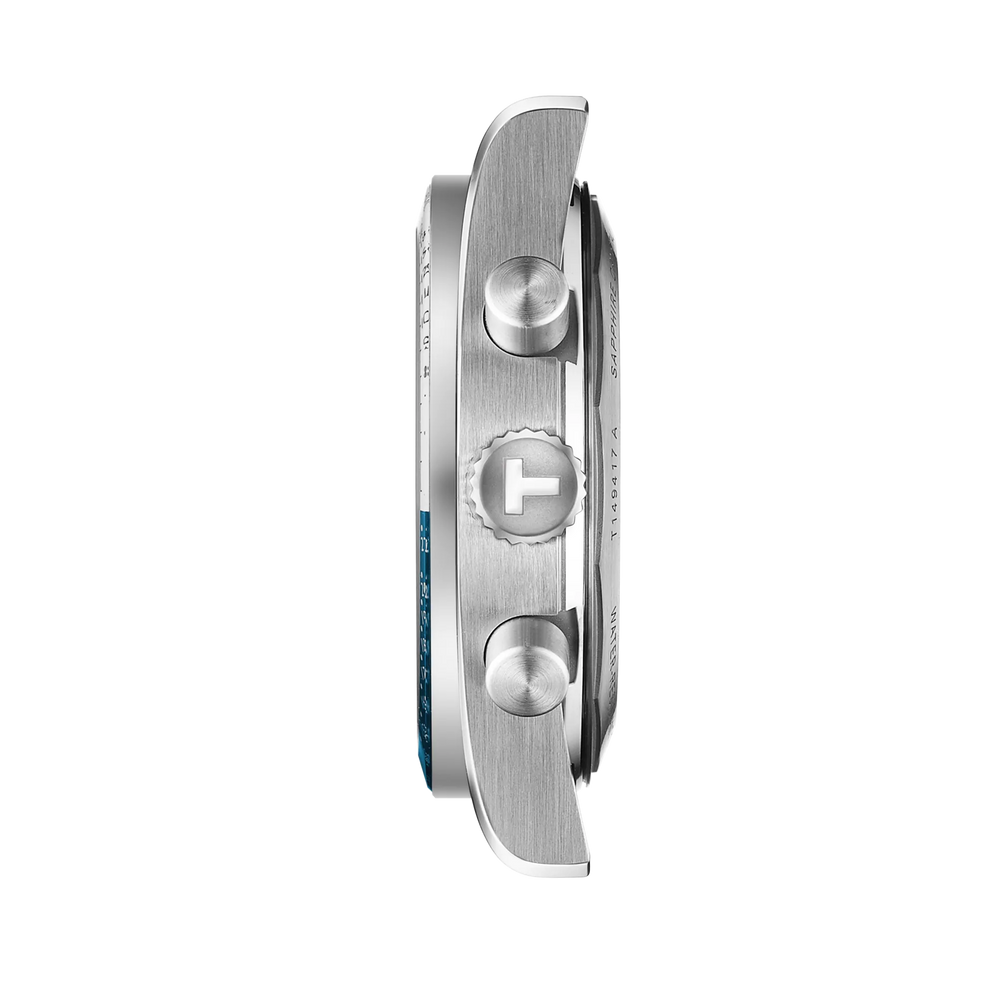 Die Tissot PR516 Chronograph Quartz ist die moderne Interpretation eines beliebten Designs aus dem Jahr 1970. Mit ihrem schlanken 40 mm-Edelstahlgehäuse und dem dynamischen Zifferblatt verkörpert diese Uhr den Geist von Geschwindigkeit und Präzision.Ausgestattet mit dem G10.212 Powerdrive Quarzwerk, bietet sie eine unübertroffene Ganggenauigkeit für einen aktiven Lifestyle. Ihre Lünette ist mit einem praktischen Tachymeter ausgestattet, während die mit Super-LumiNova®️ beschichteten Indizes für beste Ablesbarkeit unter allen Bedingungen sorgen. Das vielseitige Design wird durch ein massives, flexibles Edelstahlarmband mit Schnellwechselsystem ergänzt, für Geschäftstermine ebenso geeignet wie für Freizeitaktivitäten.Die Tissot PR516 Chronograph Quartz ist ein moderner Klassiker, der mit dem reichen Erbe von Tissot verschmilzt.Diese Ausführung besitzt ein sehr kratzfestes, einseitig entspiegeltes Saphirglas und einen zweifarbigen Mineralglas-Lünettenring in Blau und Weiß. Von dem blauen Zifferblatt heben sich Zeiger, Indizes und Hilfszifferblätter kontraststark ab. Als Verweis auf Tissots Rennsport-Geschichte ziert den Gehäuseboden die Gravur eines stilisierten historischen Sportlenkrads, umrahmt von einem Siegerkranz.