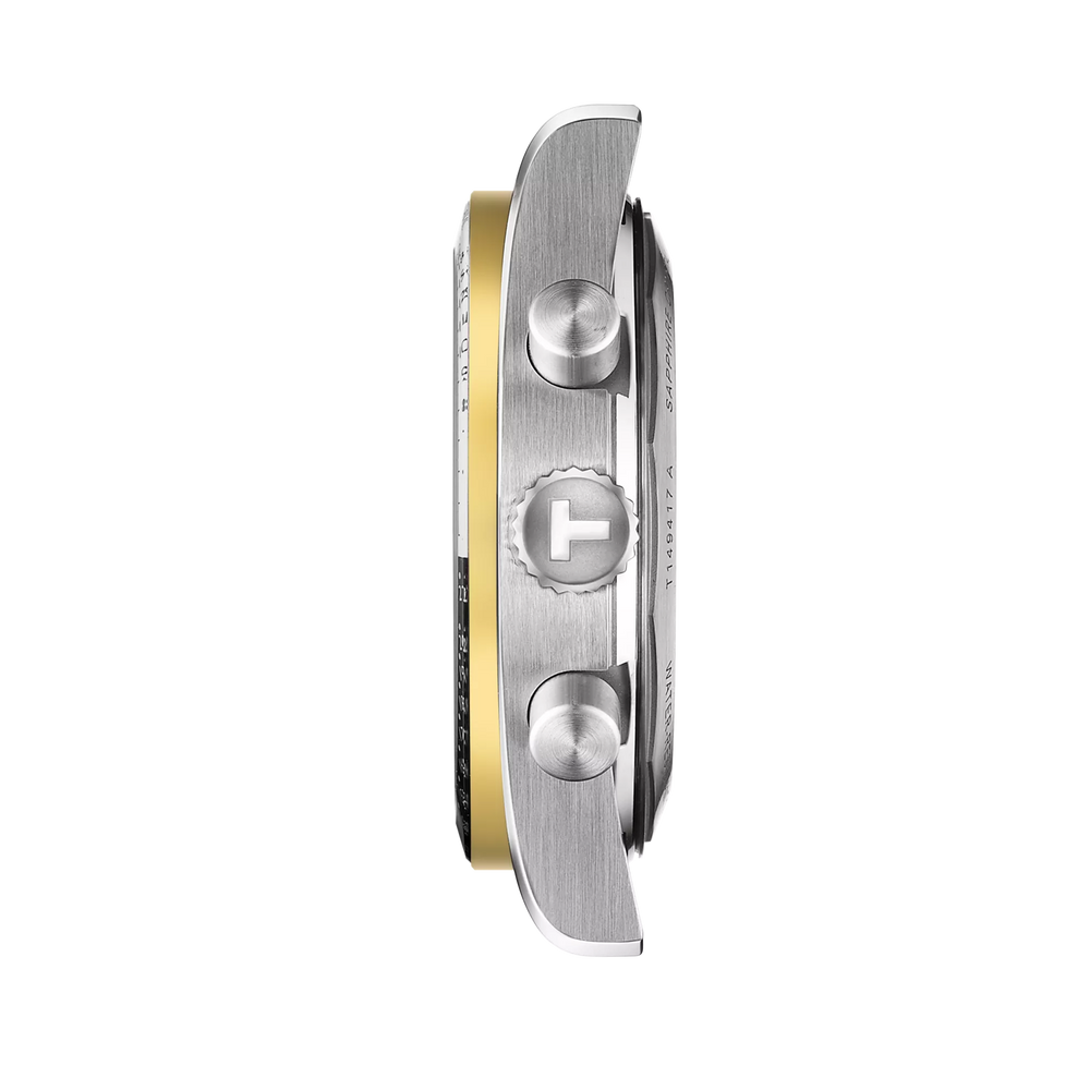 Die Tissot PR516 Chronograph Quartz ist die moderne Interpretation eines beliebten Designs aus dem Jahr 1970. Mit ihrem schlanken 40 mm-Edelstahlgehäuse und dem dynamischen Zifferblatt verkörpert diese Uhr den Geist von Geschwindigkeit und Präzision.Ausgestattet mit dem G10.212 Powerdrive Quarzwerk, bietet sie eine unübertroffene Ganggenauigkeit für einen aktiven Lifestyle. Ihre Lünette ist mit einem praktischen Tachymeter ausgestattet, während die mit Super-LumiNova®️ beschichteten Indizes für beste Ablesbarkeit unter allen Bedingungen sorgen. Das vielseitige Design wird durch ein massives, flexibles Edelstahlarmband mit Schnellwechselsystem ergänzt, für Geschäftstermine ebenso geeignet wie für Freizeitaktivitäten.Die Tissot PR516 Chronograph Quartz ist ein moderner Klassiker, der mit dem reichen Erbe von Tissot verschmilzt.Diese Ausführung besitzt ein 316L-Edelstahlgehäuse und -armband in Bicolor mit gelbgoldfarbener PVD-Beschichtung, ein sehr kratzfestes, einseitig entspiegeltes Saphirglas und einen zweifarbigen Mineralglas-Lünettenring in Schwarz und Weiß. Von dem schwarzen Zifferblatt heben sich Zeiger, Indizes und Hilfszifferblätter kontraststark ab. Als Verweis auf Tissots Rennsport-Geschichte ziert den Gehäuseboden die Gravur eines stilisierten historischen Sportlenkrads, umrahmt von einem Siegerkranz.