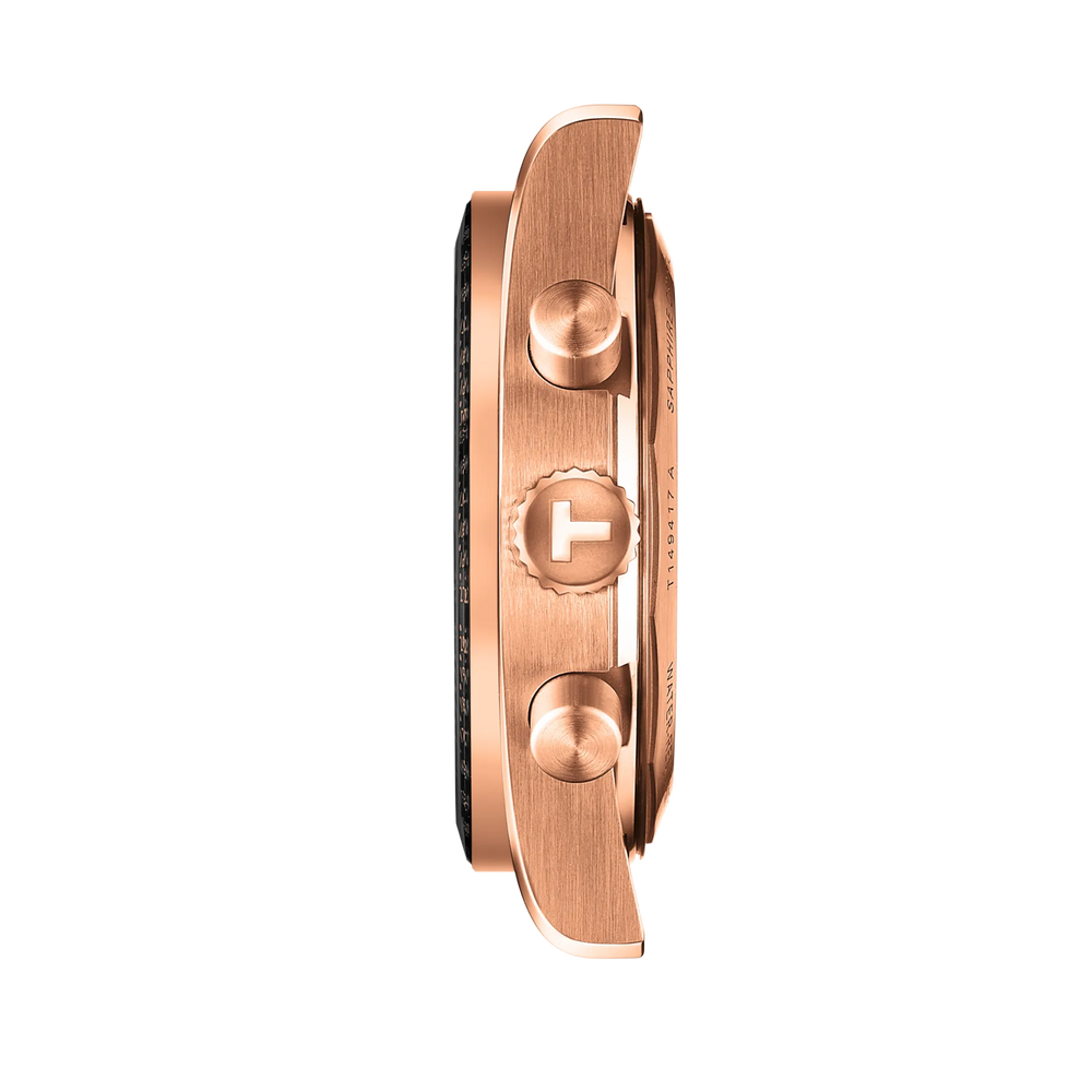 Die Tissot PR516 Quartz Chronograph positioniert sich mit ihrem schwarzen Zifferblatt und der auffälligen roségoldfarbenen PVD-Beschichtung in der vordersten Startreihe. Kombiniert mit einem ebenso massiven wie flexiblen Armband aus 316L-Edelstahl schlägt dieser Zeitmesser im bewegten Rhythmus Ihres Lebens und sorgt dafür, dass Sie Zeit und Ziel immer im Blick behalten.