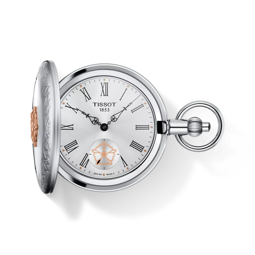Die Tissot Savonette Mechanical Kollektion besteht aus glanzvollen Taschenuhren, die das handwerkliche Können vergangener Tage mit einem Hauch Nostalgie widerspiegeln. Diese Uhren mit Swiss Made Mechanikwerk tragen die Blume aus dem Wappen der Familie Tissot und erinnern an die eindrückliche Geschichte und Tradition der Uhrmacherkunst, zu der auch Tissot beigetragen hat. Ein elegantes und traditionelles Design setzt die handwerkliche Perfektion in Szene. Bei einmaligem Drücken auf die Krone öffnet sich der Sprungdeckel mit dem Blumenwappen und zeigt die stilisierten Zeiger sowie die kleine Sekunde, welche anstelle eines klassischen Sekundenzeigers die Blume aus dem Wappen der Familie Tissot trägt. Beim zweiten Drücken der Krone zeigt sich ein versteckter Gehäuseboden, welcher sich für Gravuren eignet. Einige Details, die aus dem Wappen der Familie Tissot stammen, fallen ins Auge: Federn, die auf dem Gehäusedeckel eingraviert sind sowie die Blume, welche die Mitte verziert. Dieses rosegoldfarbene Bicolor Modell mit Messinggehäuse mit Palladiumbeschichtung und Mineralglas wird mit passender Kette geliefert und hat ein silberfarbenes Zifferblatt mit römischen Ziffern.
