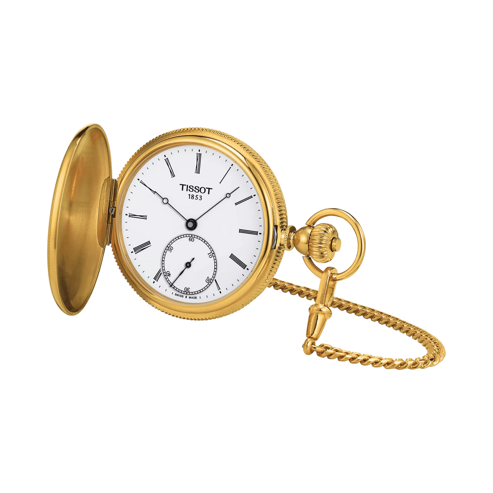 Die Tissot Savonette Mechanical Taschenuhren verbinden Geschichte und Tradition mit modernem Fachwissen. Diese Kollektion bietet die klassische runde Taschenuhr mit Sprungdeckel in unterschiedlichen Farbausführungen an, passend zu jedem persönlichen Geschmack und mit einem Hauch Tradition, der sich in den feinen Zeigern widerspiegelt und der Uhr eine Prise Nostalgie verleiht. Diese Taschenuhr mit Swiss Made Mechanikwerk mit Handaufzug besitzt ein 316L-Edelstahlgehäuse mit gelbgoldfarbener PVD-Beschichtung. Das weiße Zifferblatt mit Mineralglas hat römischen Ziffern sowie eine kleine Sekunde bei 6 Uhr und besitzt elegant geschwungene Zeiger. Die Taschenuhr wird mit passender Kette geliefert und trägt auf dem Gehäuseboden eine Wappenprägung.