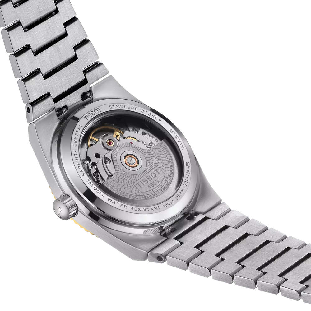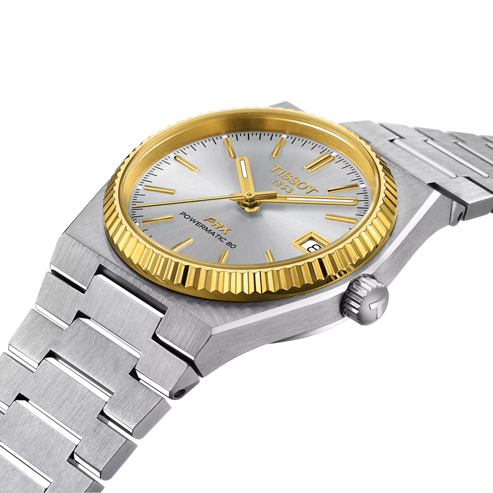 Wenn Sie nach einer flachen, lässigen Uhr mit authentischem 70er-Jahre-Feeling suchen, haben Sie sie in der PRX Powermatic 80 gefunden. Geschaffen für alle mit einem Blick für Design, gespickt mit modernen Funktionen des 21. Jahrhunderts und sich in einer Tissot Gehäuseform von 1978 präsentierend, ist die PRX ein Must-have für die Wunschliste jedes Uhrenfans. Das selbstaufziehende Powermatic 80 Werk sorgt dank der innovatioven Nivachron-Spirale für Zuverlässigkeit und Präzision. Mit bis zu 80 Stunden Gangreserve ist dieses moderne Uhrwerk dafür gemacht, mit jedem noch so schnellen Lifestyle Schritt zu halten. Diese Version der Tissot PRX Powermatic 80 besitzt eine 18K Goldlünette, die ihr einen besonderen Charakter und Eleganz verleiht.