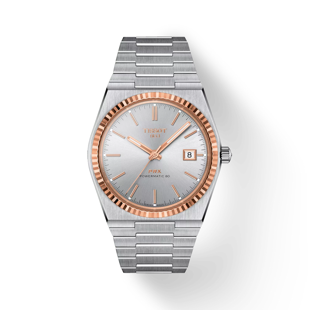 Im Jahr 1978 kreierte Tissot ein Quarzmodell, das sich durch ein schlankes Gehäuse, schmale Indexe und ein Stahlarmband auszeichnete. Sein für die Zeit typischer breiter, horizontaler Bandanstoß war perfekt in das flache Gehäuse in Tonneau-Form integriert. Einige Jahre später ließ Tissot den Namen PRX eintragen. „PR“ steht dabei für „präzise“ und „robust“. Das „X“ steht für die römische Zahl Zehn und für den Druck von 10 Bar, der einer Tiefe von 100 Metern entspricht, bis zu denen die Uhr wasserdicht bleibt. 2021 präsentierte Tissot die neue PRX als moderne Interpretation des Vorgängermodells. Das 316L-Edelstahl Gehäuse der Tissot PRX hat einen Durchmesser von 40 mm. Es weist eine leichte Tonneau-Form auf und wird von einer schmalen, runden Lünette geziert. An den Seiten wechseln sich vertikal gebürstete, abgerundete Finishes mit polierten Facetten ab. Die Tissot PRX Powermatic 80 Stahl & 18K Gold ist mit einer kannelierten 18K Echtgoldlünette in Roségold ausgestattet, die – gemeinsam mit den gleichfarbigen Indizes und Zeigern – einen schönen Kontrast zum blauen Zifferblatt bildet. Die Linien des Gehäuses verlängern sich direkt und ohne Einsatz der traditionellen Hörner in das Armband. Dessen auffälligstes Merkmal ist seine Reihe großer Glieder, die die gesamte Breite beanspruchen. Seine Flexibilität und Geschmeidigkeit machen es zu einem echten Erfolg ergonomischen Designs und vermitteln ein außerordentliches Tragegefühl. Das Satinieren an den Außenseiten ist ebenso sorgfältig ausgeführt wie das Polieren der Innenflächen. Die Zeiger der Tissot PRX Powermatic 80 Stahl & 18K Gold sind mit einer SuperLumiNova®-Beschichtung versehen und wurden mit nur sehr geringem Abstand übereinandergesetzt. Dies erlaubt es, das Zifferblatt näher an das Uhrenglas zu bringen. Der von den Tissot-Designern so erzielte optische Effekt lässt das Gehäuse der Uhr noch flacher und schlanker erscheinen, als es tatsächlich ist. Die Tissot PRX Powermatic 80 Stahl & 18K Gold verfügt über ein kratzfestes, beidseitig entspiegeltes Saphirglas sowie über einen Sichtboden aus Mineralglas. Ihr Swiss Made Automatikwerk mit bis zu 80 Stunden Gangreserve ist mit einer Nivachron-Spiralfeder versehen, welche für eine herausragende Magnetfeldsicherheit bekannt ist. Die Uhr besitzt ein 316L-Edelstahlarmband mit Schnellwechselsystem und einer Butterfly-Faltschließe mit Drückern.