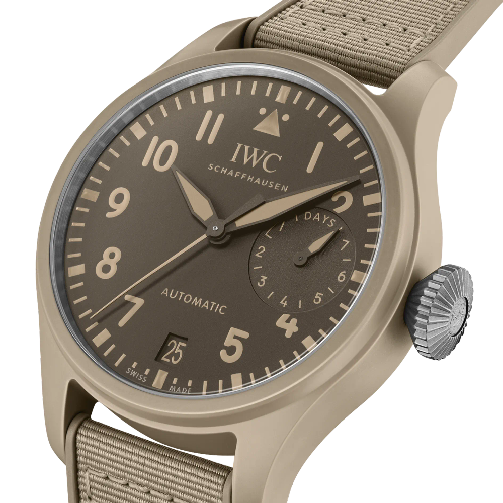 Mit der Big Pilot’s Watch TOP GUN Edition «Mojave Desert» setzt IWC die Serie von TOP GUN Modellen mit Gehäusen aus sandfarbener Keramik fort.